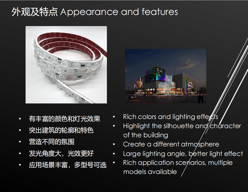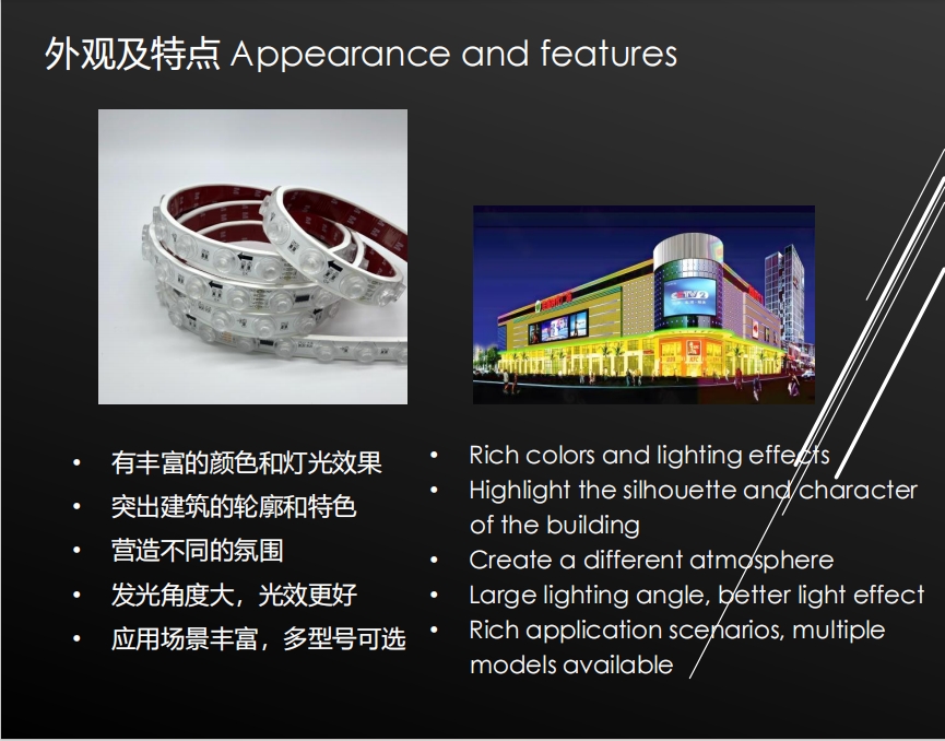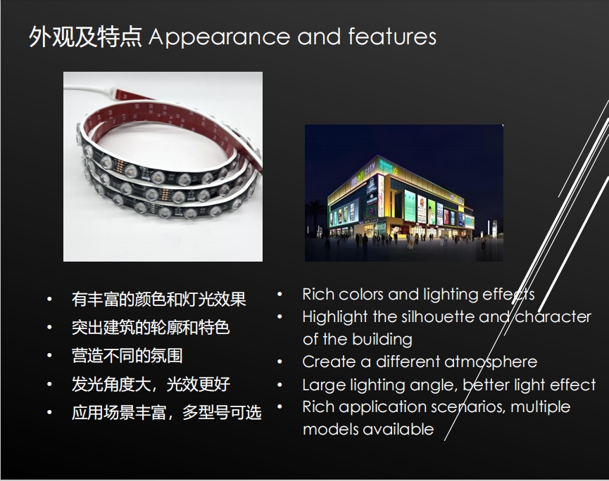 生产LED单色/幻彩/七彩裸板灯带、LED单色/幻彩硅胶灯带、LED单色/幻彩/七彩硅胶实芯挤出灯带及柔性洗墙灯为主及承接各种定制灯。专注于各种户外文旅亮化,酒吧KTV,舞台灯光,婚礼酒店宴会厅,景观游乐场,楼体户外造型,专门解决各种工程疑难杂症,现场指导安装调试以及各类编程服务。