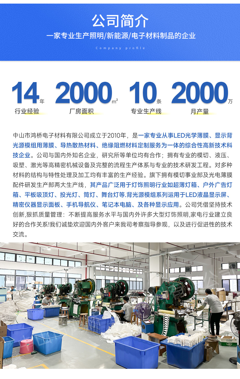 鸿桥公司成立于2010年,是一家专业从事LED光学薄膜,显示屏背光源模组专用薄膜,反射扩散绝缘阻燃材料定制服务为一体的综合性高新技术科技企业,公司与国内外知名企业,研究所等单位均有合作;拥有专业模切、热压、吸塑、硫化、激、折弯等高精密机械设备及完整的流程生产体系与专业的技术研发工程团队。对多种材料的结构与特性处理均有丰富的生产经验。公司拥有模切事业部与光电薄膜材料研发及阻燃绝缘材料生产部三大生产线,其产品广泛应用于灯饰照明行业如超薄灯箱、户外广告灯箱、平板吸顶灯、投光灯、筒灯、舞台灯等。背光源模组系列运用于LED液晶显示屏、精密仪器显示面板、手机导航仪、笔记本电脑、及各种电子显示设备。阻燃绝缘系列运用于新能源汽车、电源、通讯产品、数码相机、电脑、打印机、音响产品、家用电器、空调、灯饰、玩具等行业。我们秉承“精确·可靠·专业”的生产精神和服务理念,凭借着先进的技术、卓越的品质、完善的服务,坚持技术创新,狠抓质量管理,不断提高服务水平,与国内外许多大型灯饰照明、家电行业建立良好的合作关系!我们诚挚欢迎国内外客户来我司考察指导参观,以及进行促进性的技术交流。