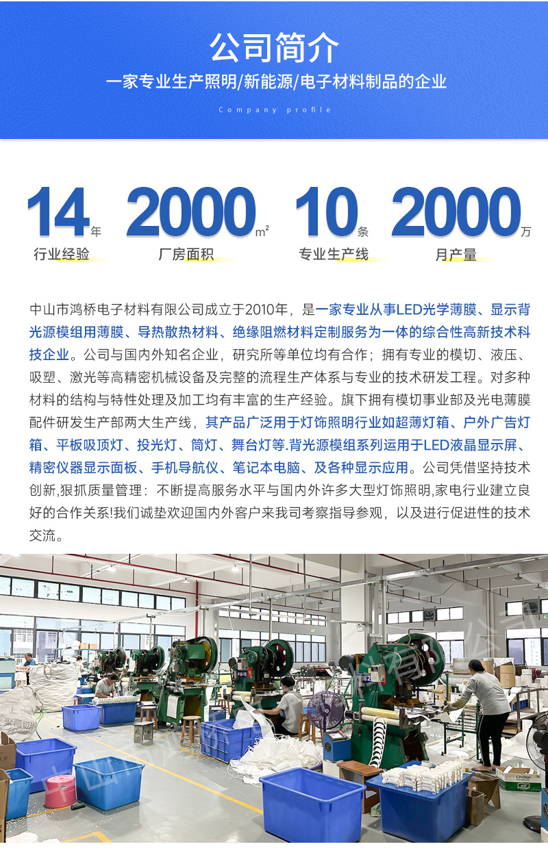 鸿桥公司成立于2010年,是一家专业从事LED光学薄膜,显示屏背光源模组专用薄膜,反射扩散绝缘阻燃材料定制服务为一体的综合性高新技术科技企业,公司与国内外知名企业,研究所等单位均有合作;拥有专业模切、热压、吸塑、硫化、激、折弯等高精密机械设备及完整的流程生产体系与专业的技术研发工程团队。对多种材料的结构与特性处理均有丰富的生产经验。公司拥有模切事业部与光电薄膜材料研发及阻燃绝缘材料生产部三大生产线,其产品广泛应用于灯饰照明行业如超薄灯箱、户外广告灯箱、平板吸顶灯、投光灯、筒灯、舞台灯等。背光源模组系列运用于LED液晶显示屏、精密仪器显示面板、手机导航仪、笔记本电脑、及各种电子显示设备。阻燃绝缘系列运用于新能源汽车、电源、通讯产品、数码相机、电脑、打印机、音响产品、家用电器、空调、灯饰、玩具等行业。我们秉承“精确·可靠·专业”的生产精神和服务理念,凭借着先进的技术、卓越的品质、完善的服务,坚持技术创新,狠抓质量管理,不断提高服务水平,与国内外许多大型灯饰照明、家电行业建立良好的合作关系!我们诚挚欢迎国内外客户来我司考察指导参观,以及进行促进性的技术交流。