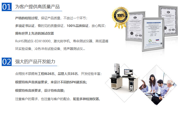 合翔(常州)电子有限公司主要生产蜂鸣器(电磁式蜂鸣器、压电式蜂鸣器,贴片蜂鸣器),扬声器,受话器,麦克风和电感。公司成立于1996年,位于江苏省常州市武进高新区内,总占地面积33000平方米,员工1200名。工程师26名,品管人员35名,具有较强的开发能力。现有500多个品种,月产量1200万只。 产品主要用于医疗设备、汽车仪表、汽车电子、安防、笔记本电脑、电脑主机板、无绳电话、不间断电源、报警器、数码相机、蓝牙耳机、GPS和家用电器等。 公司的最终用户有Sony、V-Tech、APC、 Intel、IBM、ASUS、APC、Whirlpool、BYD、奇瑞QQ、 Flextronic 、Samsung 、Shinco 、Pioneer、 Rannai 、DELL等等。公司拥有世界上先进的丹麦BK2012电声测试系统和RoHs测试仪器,2007年6月全面导入RoHs 标准生产产品.目前公司产品主要销往台湾、香港、韩国、美国、欧洲等国家和地区,同时也在积极寻求国内客户。 本着“让顾客满意”的经营指导思想,公司非常重视质量控制和质量管理。已经获得ISO9001:2000、ISO14001:2004体系认证和 TS16949:2002证书。质量第 一是公司的理念,客户满意是我们的追求,竭诚为国内外客户提供优质的产品与服务。