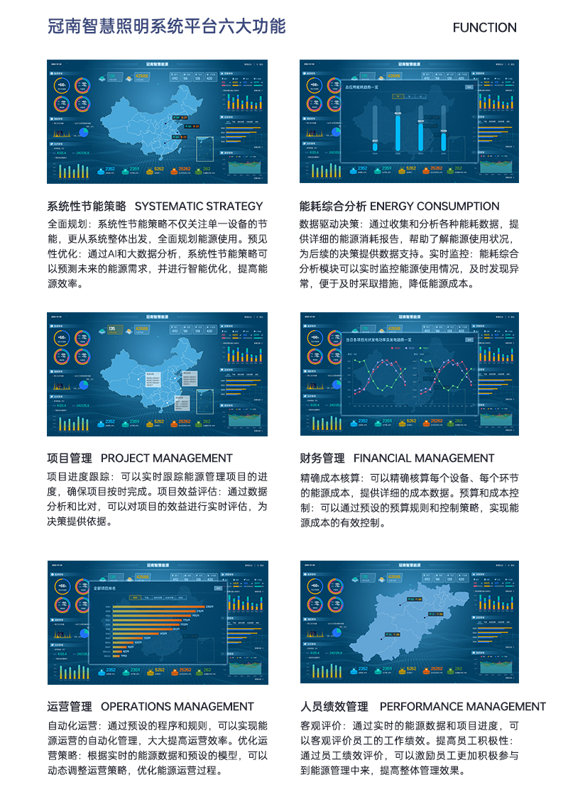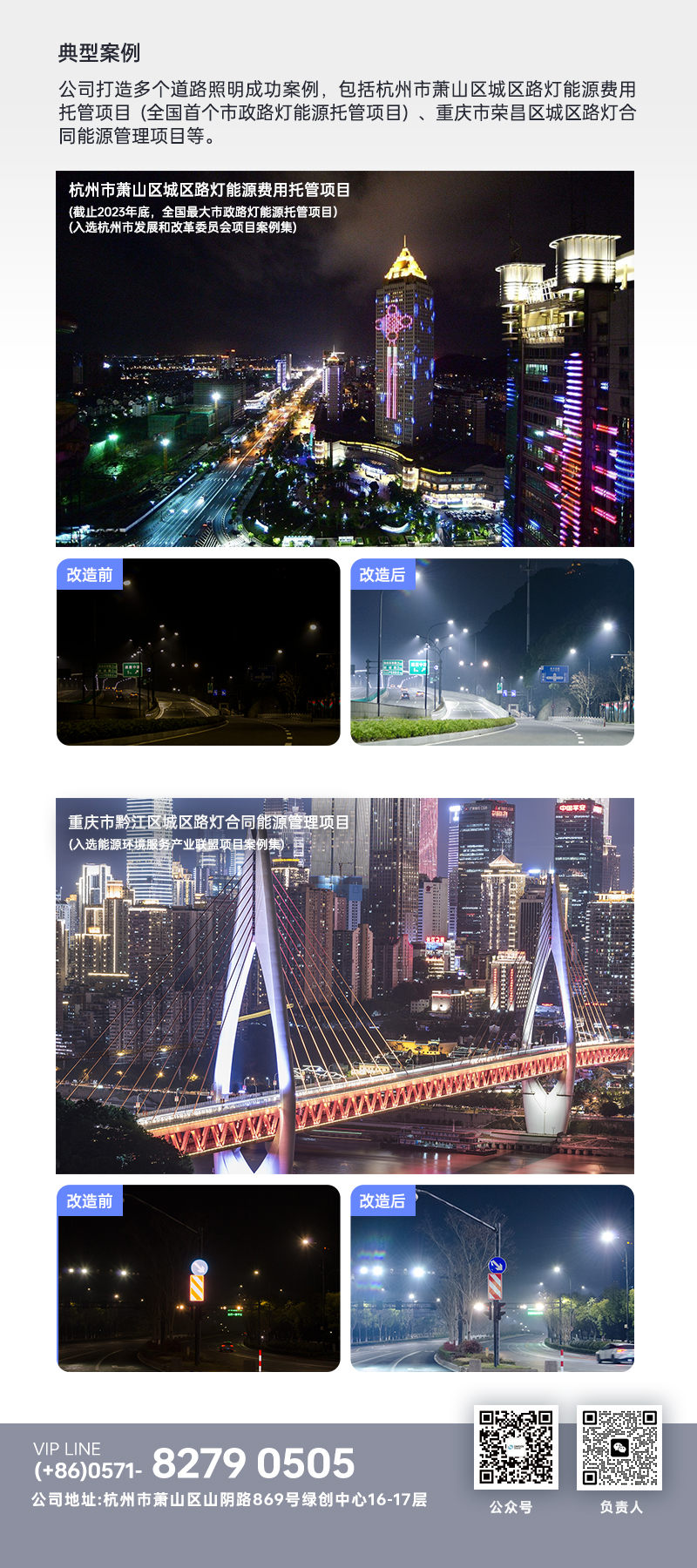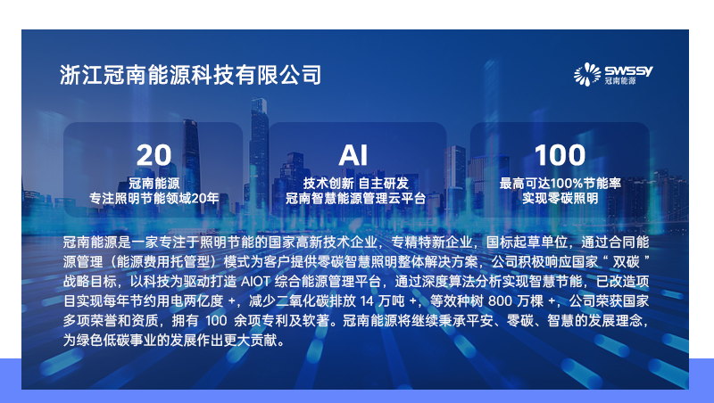 浙江冠南能源科技有限公司创立于2004年,总部位于浙江杭州,注册资本5000万元,公司隶属于浙江冠南控股集团,是一家国家高新技术企业、专精特新企业及国标起草单位,通过合同能源管理(能源费用托管型)模式为客户提供路灯能源托管整体解决方案,涵盖城市道路、桥梁隧道、码头、机场等室外公共照明领域。公司荣获合同能源管理AAAAA认证、守合同重信用AAA认证等多项荣誉。公司积极践行国家“双碳”战略目标,联合北工大共建“北工大·浙江冠南碳中和未来技术研究院”,以科技为驱动,打造AloT数字化能源管理平台,通过深度算法分析实现智慧节能,已改造项目实现每年节约用电两亿度+,减少二氧化碳排放14万吨+,等效种树800万棵+,凭借良好的信誉和优异的业绩,多次荣获中国节能协会节能服务产业委员会评选的公共设施领域节能服务优秀企业和节能服务产业最具成长性企业称号,公司具备城市及道路照明工程专业资质、电子与智能化工程专业资质等多项专业资质,已获得200余项知识产权,并被认定为杭州市专利试点企业。冠南能源将继续秉承平安、零碳、智慧的发展理念,为绿色低碳事业贡献力量。