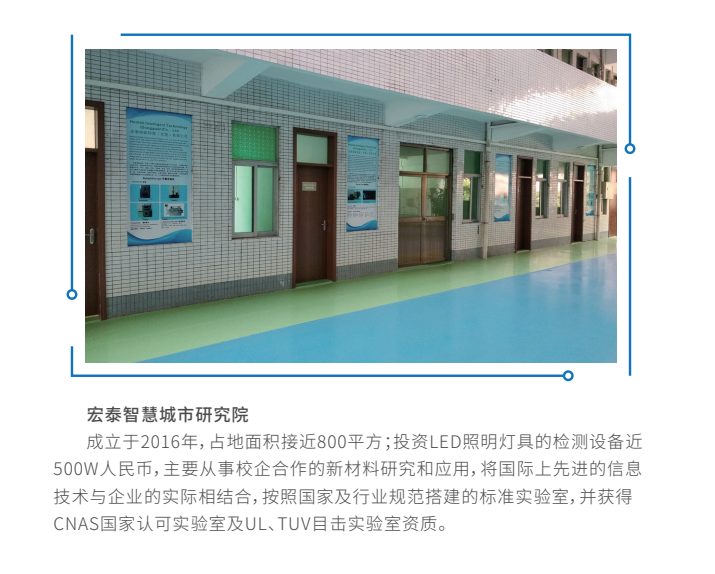 宏泰智能科技(东莞)有限公司是一家专业从事户外照明、道路照明、工业照明、体育场馆照明、植物照明及车灯设计、制造的国际化照明科技企业,主要出口欧美及澳洲等地区,是多家国际一线品牌的ODM工厂,在灯光效果、散热技术、智能控制等方面拥有雄厚的基础和独特优势。 公司秉承“速度、创新、可靠、感恩”的经营理念,尽最大可能地满足客户的需求和想法;公司日常管理严格执行SGS认证的 ISO:9001国际质量体系、ISO:14001环境保护、IATF16949准则,目前拥有先进的设计软件及平台,完善的实验室测试设备和现代化生产制造技术,在东莞工厂内已搭建已知国际及国内(CQC/CCC)认证所需要的测试设备(UL、CE);且拥有一支优秀的销售团队,使得公司在较短的时间内,得到了发展及壮大,成为LED照明行业崛起的一颗新星;公司已获得“专精特新”企业、高新技术企业等荣誉称号,且拥有完整的自动化生产线,无尘车间,检测设备齐全,为公司的研发、生产提供了很好的硬件保障;优质的产品和庞大的产能储备, 也为公司带来了优质的客户,为企业的良性、高速发展打下了坚 实的基础。 以下为集团各分公司简介 宏泰智能科技(东莞)有限公司——“精专特新”企业、高新技术企业成立于2019年,占地面积10000平方,建筑面积接近20000平方;投资6000W人民币,主要从事户外LED大功率照明灯具的设计研发、生产和销售。 东莞市爱多照明有限公司——高新技术企业 成立于2013年,占地面积15000平方,建筑面积23000平方,投资4000W人民币,于2022年3月份归属宏泰智能科技旗下;主要从事LED玉米灯具的设计研发、生产和销售。 阿拉丁智行(东莞)照明有限公司 成立于2022年,占地面积16000平方,建筑面积接近20000平方;投资1000W人民币,主要从事车灯灯具的设计研发、生产和销售。 宏泰智慧城市研究院 成立于2016年,占地面积接近800平方;投资LED照明灯具的检测设备近500W人民币,主要从事校企合作的新材料研究和应用,将国际上先进的信息技术与企业的实际相结合,按照国家及行业规范搭建的标准实验室,并获得CNAS国家认可实验室及UL、TUV目击实验室资质。 东莞市精迈塑胶五金制品有限公司 成立于2016年,占地面积3000平方;投资1000W人民币,主要从事LED照明灯具的铝合金压铸套件及塑胶注塑制品,配套宏泰智能科技内部照明产品使用。 深圳市宏辉光电智能科技有限公司 成立于2019年,主要从事知名品牌元器件的代理和分销。 宏泰照明工程(东莞)有限公司 和 深圳市世纪众普森光电有限公司 分别成立于2018年底,投资2000W人民币,主要从事LED照明工程的策划、设计、选型、施工和维护。 东莞弘沛照明有限公司 公司成立于2022年10月18日, 主要从事LED 植物灯研发、设计和产品销售。