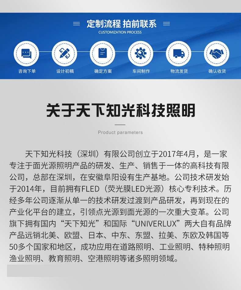 天下知光科技(深圳)有限公司创立于2017年4月,是一家专注于面光源照明产品的研发、生产、销售于一体的高科技有限公司,总部在深圳,在安徽阜阳设有生产基地。 公司技术研发始于2014年,目前拥有FLED(荧光膜LED光源)核心专利技术。历经多年,公司逐渐从单一的技术研发过渡到产品研发,再到现在的产业化平台的建立,引领点光源到面光源的一次重大变革。 公司拥有国内“天下知光”和国际“UniverLUX”两大自主品牌,并获多项专利和进入国内外市场的产品认证。其产品在道路照明、隧道照明、空港照明、工业照明、码头照明、园区照明、教育照明、防爆照明、场馆照明和其他特种照明等广泛的应用领域。FLED已成为满足国内外照明市场的全天候、全领域高科技领衔产品。 公司发展先后经历了几个阶段: 2017年4月成立天下知光科技(深圳)有限公司;2021年7月成立天下知光科技(安徽)有限公司;2023年3月成立天下知光科技(辽宁)有限公司;2023年5月成立天下知光低碳科技(山东)有限公司。2020年12月天下知光科技(深圳)有限公司被授予国家高新技术企业称号。 天下知光作为FLED技术的开创者,致力于推动半导体照明技术和产业的提升与发展,以技术研发为引领,以客户和市场应用为中心,以产品质量和专业服务为基石,“秉烛天下,笃实知光”!矢志不移地践行企业的使命——“创新之光,点亮未来”!