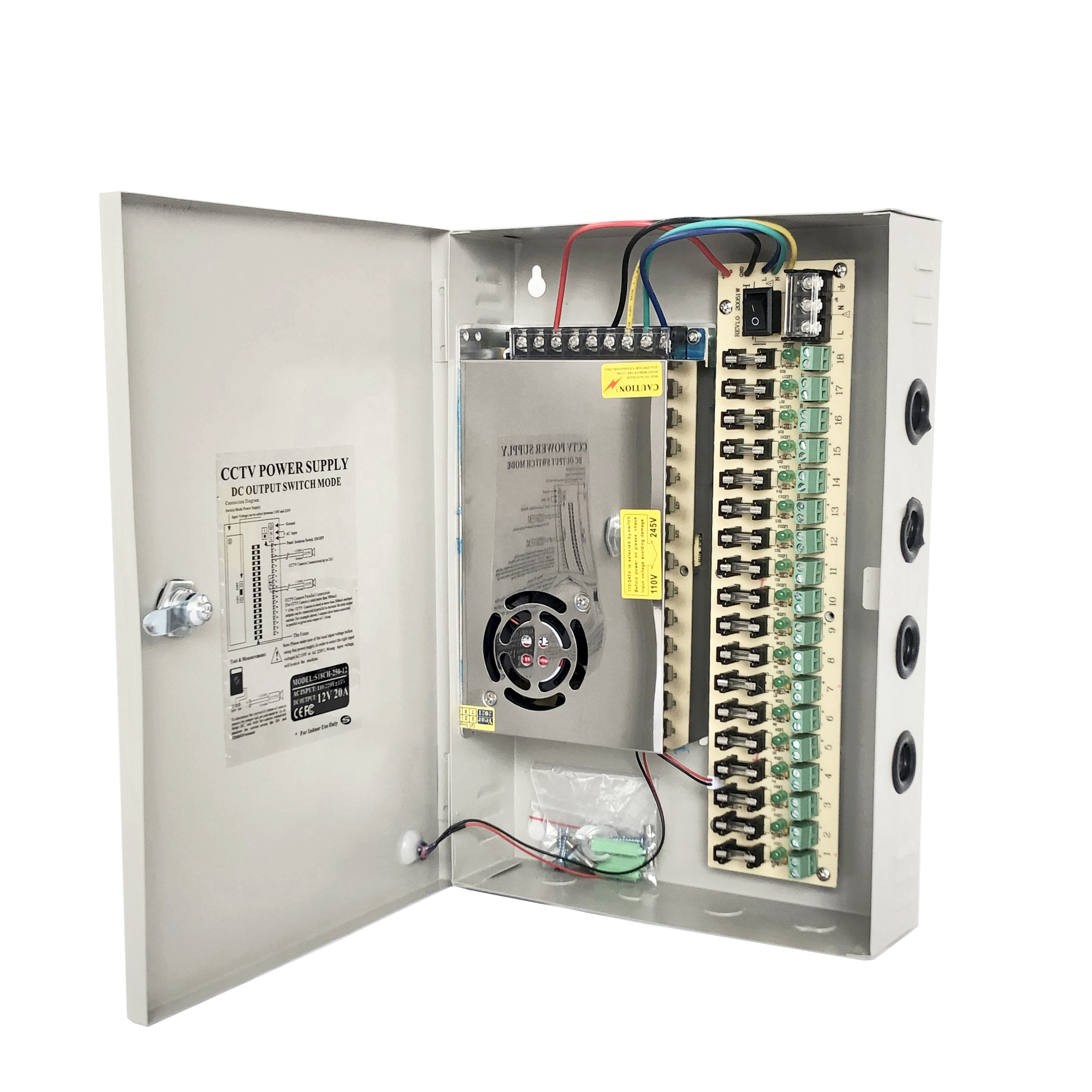 产品详细参数输入电压范围110V/220V AC±20% 47-63Hz过载保护105-150%d打嗝模式/自动恢复输入电流2A/110V 1A/220V过压保护115-135%切断模式/自动恢复输出电压/电流12V DC/0-20A短路保护断电/自动恢复工作效率≥80%启动/上升/保持时间200ms/50ms/20ms负载稳定度±2%工作温度/湿度-10°C~60°C/20% 90RH冲击电流冷启动电流 20A/110 40A/220V外形尺寸300×225×75mm漏电电流1mA/240v AC输出接线端18路输出直流电压可调范围输出电压±10%重量/包装2.08kg/台;10台/箱纹波及噪音100mv箱规/毛重470*420*335mm