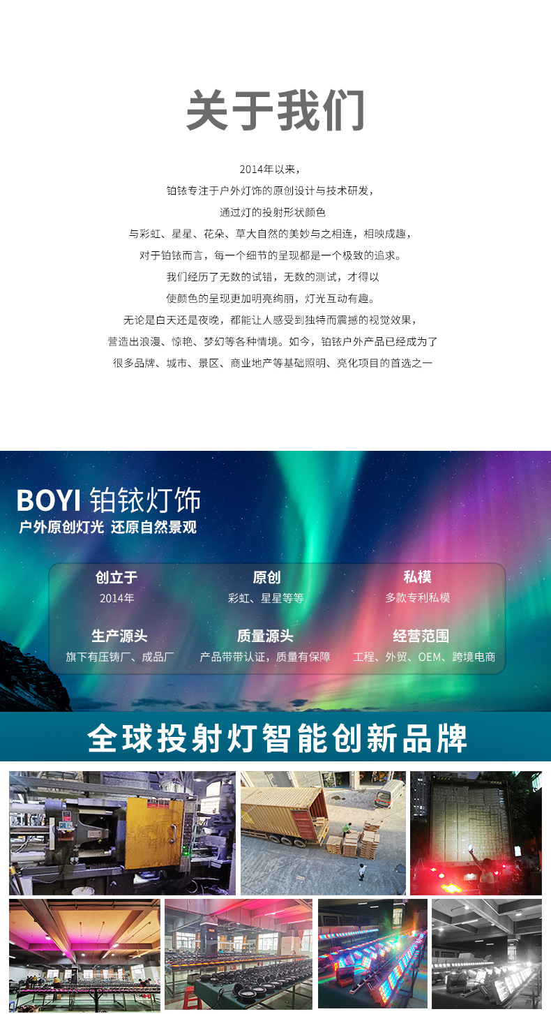 2014年以来,铂铱专注于户外灯饰的原创设计与技术研发,通过灯的投射形状颜色与彩虹、星星、花朵、草大自然的美妙与之相连,相映成趣,对于铂铱而言,每一个细节的呈现都是一个极致的追求。我们经历了无数的试错,无数的测试,才得以使颜色的呈现更加明亮绚丽,灯光互动有趣。无论是白天还是夜晚,都能让人感受到独特而震撼的视觉效果,营造出浪漫、惊艳、梦幻等各种情境。如今,铂铱户外产品已经成为了很多品牌、城市、景区、商业地产等基础照明、亮化项目的首选之一。