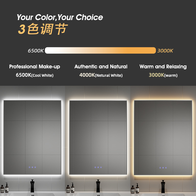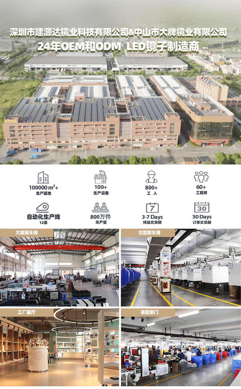 【加工优势】支持多尺寸、多造型、多功能订制、LOGO可订制,我们是深圳专业家装镜、化妆镜厂家,有自己的大玻璃车间、模具车间、注塑车间、喷油线印车间、SMT车间和装配产线,产品品质全部内部控制。