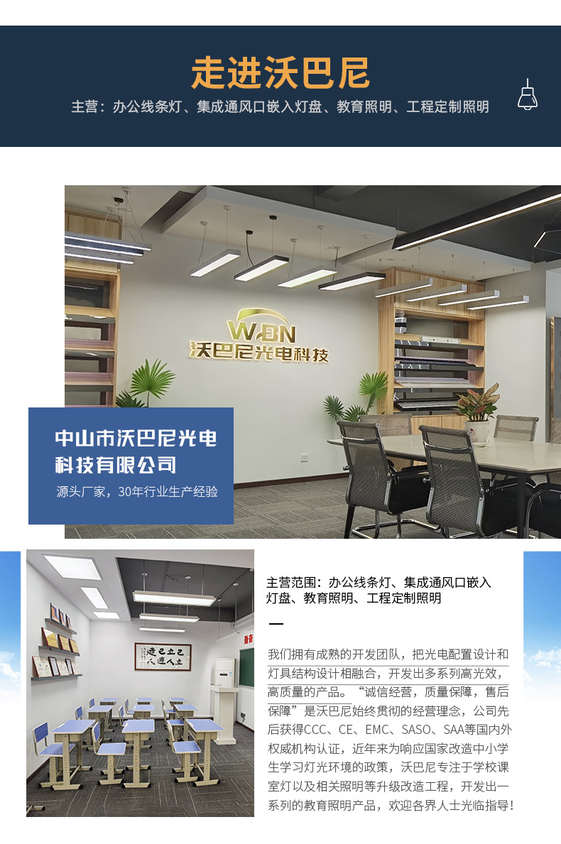 中山市沃巴尼光电科技有限公司坐落于被誉为中国灯饰之都的中山市古镇镇,前身为专业生产商业办公照明、灯饰设计以及配套服务的专业生产厂家,实力雄厚,拥有古镇最大的注塑机和配套生产线,产品种类繁多,质量优越,二十多年来致力出口产品到世界各地,并在国内市场深得各类项目开发商的喜爱。 近年来为响应国家改造中小学生学习灯光环境的政策,于2019年成立中山沃巴尼光电科技有限公司,专注于学校课室灯以及相关照明等升级改造工程。公司团队成熟稳健,具备10多年办公照明领域的设计、生产以及销售经验,潜心研究,打造出 “沃巴尼”品牌教育照明系列,为保护青少年眼睛视力致力做出服务和贡献。 眼睛是心灵之窗,拥有明亮清澈的眼睛是每一个青少年的权利,让他们在明亮的课室灯光下学习是我们孜孜以求、不断进步的目标。我们拥有专业的研发能力和生产技能,拥有多种名誉证书以及产品资质证书,产品质量过硬,配套服务深入到位,应对不同市场需求,并能及时做出对应的解决方案,满足不同层面的需求和研发。选择“沃巴尼”品牌课室灯,是对青少年视力的一种爱护。让我们携手共进,共同守护那一扇扇心灵之窗。
