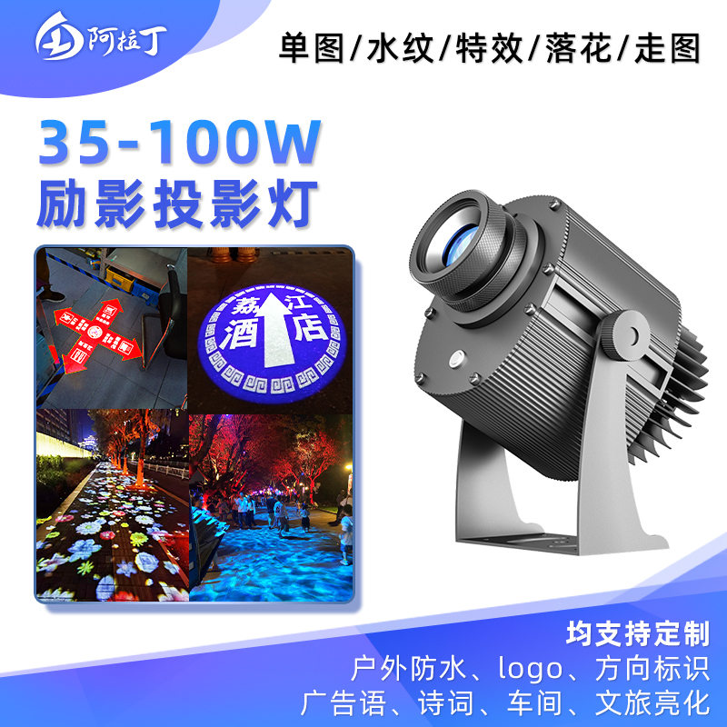 查看更多产品信息请访问罗帕德官网:www.aladdin-noparde.com联系电话:0755-27595741可选功率:30W/80W/150W/300W/500W电压:100V-265V频率: 50-60HZ色温:3000-9000K光源寿命:35000 hours镜头比例:1:0.65 1:1 1:2.5投射角度:可调防护等级:IP65光源芯片品牌: 德国欧司朗LOGO灯片:德国进口耐高温玻璃灯体材质:优质高强度铝材表面处理:高温氧化灯体颜色:黑色冷却方式:风冷散热安装方式:吸顶式应用:通道指示、品牌形象展示、节日庆典、KTV、楼宇亮化、公园亮化、商场亮化