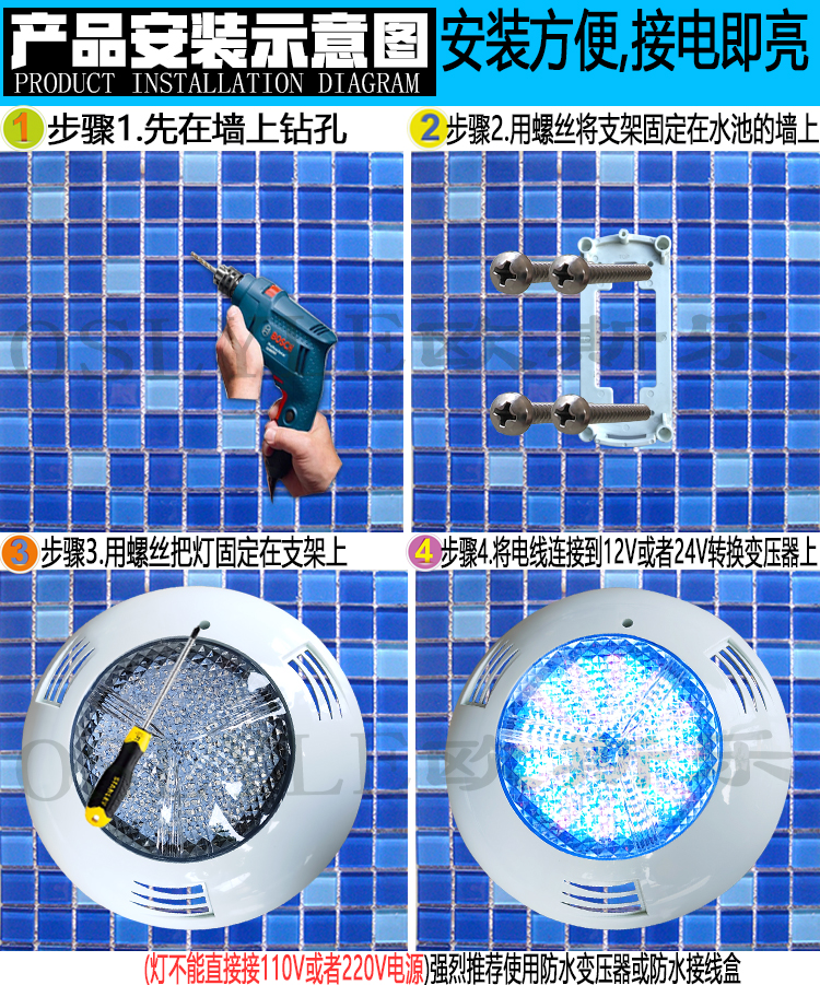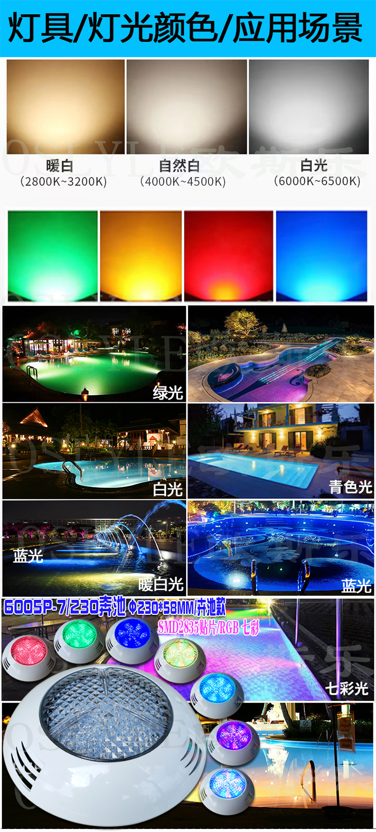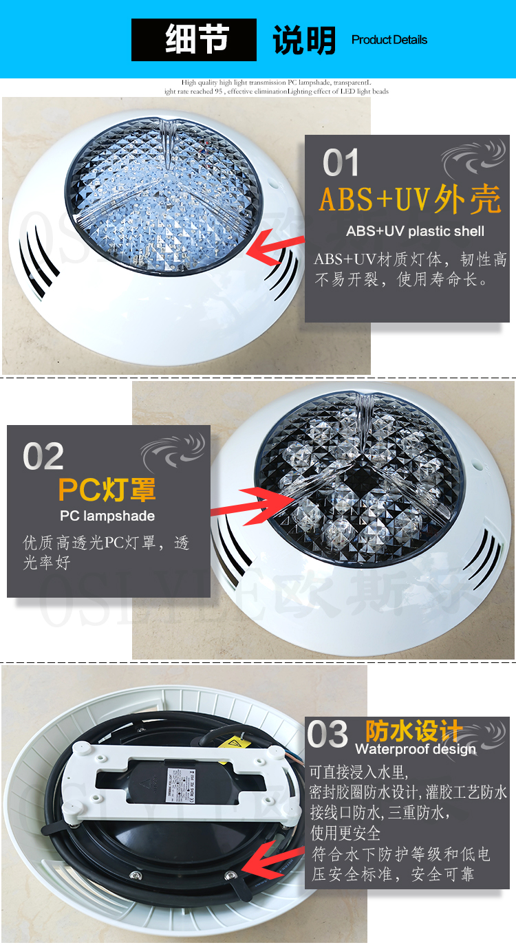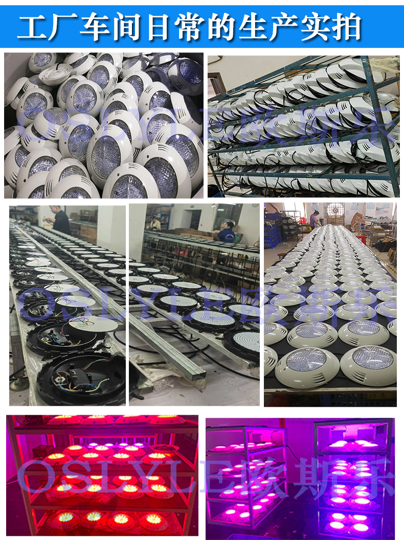 中山市欧斯乐灯饰有限公司是一家专业生产水下LED灯的厂家。我们拥有先进的技术面貌,先进的设备和工艺。我们还通过了ROHS, IP68, CE, FCC。通过iso9001、ISO 2000体系认证。我们专业从事各种水下LED灯的生产已有十多年的历史。产品包括壁挂式不锈钢挂灯,塑料,全密封,PAR杯和LED灯。光源效果,多色,单色,内部控制,渐变,外部控制DMX512,同步彩色,关机模式控制,四键,六键,十八键单对一遥控器和彩色效果可选,广泛应用于游泳池。喷泉水池、景观照明、别墅泳池、别墅泳池、花园景观、家庭水族馆等。例如:塑料农场。我们有8台注塑机生产塑料零件和外壳。拥有3条流水线生产产品,日产量1500- 2000条。我们的QC对所有产品进行在线检验。主要市场是俄罗斯。美国、英国、澳大利亚、德国等等。我们曾与Bright star,Ledis LTD.合作。我们非常重视质量控制,在工厂有严格的质量控制体系。覆盖材料供应评估,来料检验。评估分类和仓库保管以及生产质量控制。完善的生产工艺,先进的制造技术,严格的检验手段和良好的服务在客户中享有很高的声誉。如果您对我们的产品感兴趣,欢迎您访问我们的网站和我们的阿里巴巴网站:www。在您方便的时间获取更多详细信息。如果你有任何问题,请不要犹豫告诉我们。我们将尽力为您服务。