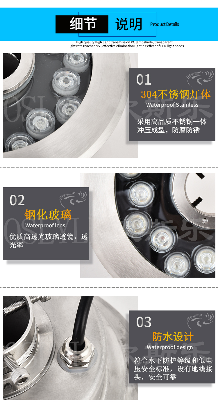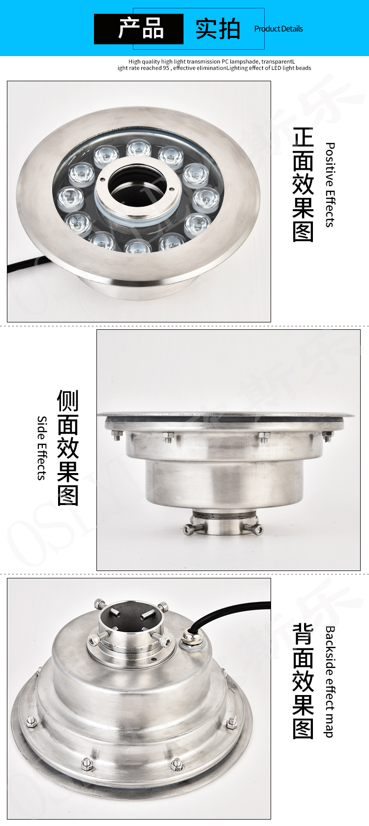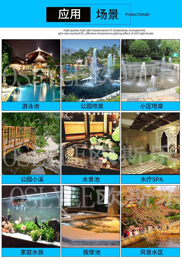 中山市欧斯乐灯饰有限公司是一家专业生产水下LED灯的厂家。我们拥有先进的技术面貌,先进的设备和工艺。我们还通过了ROHS, IP68, CE, FCC。通过iso9001、ISO 2000体系认证。我们专业从事各种水下LED灯的生产已有十多年的历史。产品包括壁挂式不锈钢挂灯,塑料,全密封,PAR杯和LED灯。光源效果,多色,单色,内部控制,渐变,外部控制DMX512,同步彩色,关机模式控制,四键,六键,十八键单对一遥控器和彩色效果可选,广泛应用于游泳池。喷泉水池、景观照明、别墅泳池、别墅泳池、花园景观、家庭水族馆等。例如:塑料农场。我们有8台注塑机生产塑料零件和外壳。拥有3条流水线生产产品,日产量1500- 2000条。我们的QC对所有产品进行在线检验。主要市场是俄罗斯。美国、英国、澳大利亚、德国等等。我们曾与Bright star,Ledis LTD.合作。我们非常重视质量控制,在工厂有严格的质量控制体系。覆盖材料供应评估,来料检验。评估分类和仓库保管以及生产质量控制。完善的生产工艺,先进的制造技术,严格的检验手段和良好的服务在客户中享有很高的声誉。如果您对我们的产品感兴趣,欢迎您访问我们的网站和我们的阿里巴巴网站:www。在您方便的时间获取更多详细信息。如果你有任何问题,请不要犹豫告诉我们。我们将尽力为您服务。