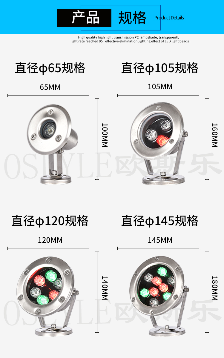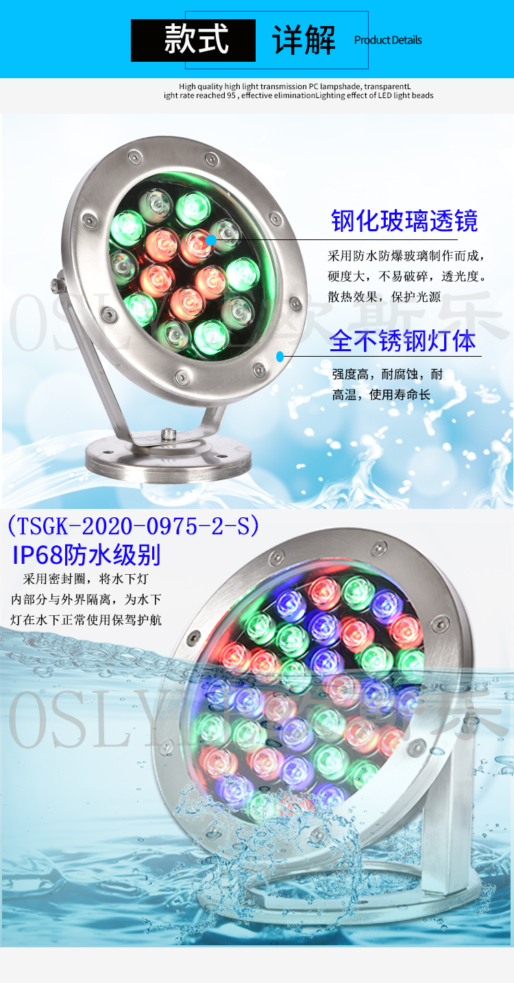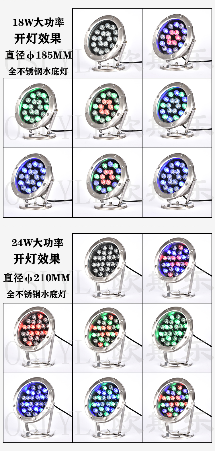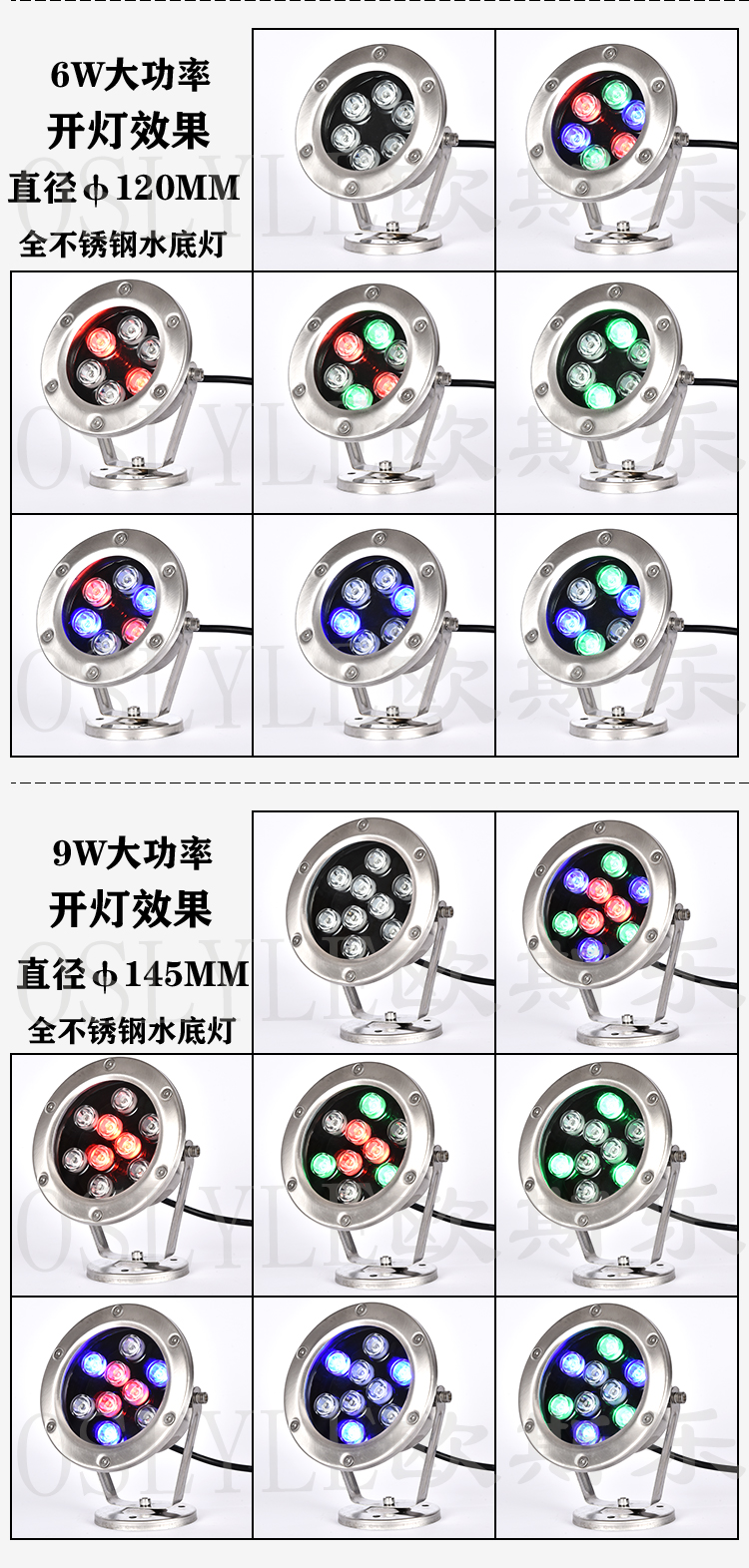 中山市欧斯乐灯饰有限公司是一家专业生产水下LED灯的厂家。我们拥有先进的技术面貌,先进的设备和工艺。我们还通过了ROHS, IP68, CE, FCC。通过iso9001、ISO 2000体系认证。我们专业从事各种水下LED灯的生产已有十多年的历史。产品包括壁挂式不锈钢挂灯,塑料,全密封,PAR杯和LED灯。光源效果,多色,单色,内部控制,渐变,外部控制DMX512,同步彩色,关机模式控制,四键,六键,十八键单对一遥控器和彩色效果可选,广泛应用于游泳池。喷泉水池、景观照明、别墅泳池、别墅泳池、花园景观、家庭水族馆等。例如:塑料农场。我们有8台注塑机生产塑料零件和外壳。拥有3条流水线生产产品,日产量1500- 2000条。我们的QC对所有产品进行在线检验。主要市场是俄罗斯。美国、英国、澳大利亚、德国等等。我们曾与Bright star,Ledis LTD.合作。我们非常重视质量控制,在工厂有严格的质量控制体系。覆盖材料供应评估,来料检验。评估分类和仓库保管以及生产质量控制。完善的生产工艺,先进的制造技术,严格的检验手段和良好的服务在客户中享有很高的声誉。如果您对我们的产品感兴趣,欢迎您访问我们的网站和我们的阿里巴巴网站:www。在您方便的时间获取更多详细信息。如果你有任何问题,请不要犹豫告诉我们。我们将尽力为您服务。