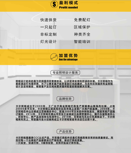 卡尔照明成立于2000年,是一家集设计、生产、市场营销及服务的专业、系统化照明解决方案服务商。公司以全球视野,引领未来应用趋势为导向,针对细分市场的发展特点和需求,形成酒店、店铺、地产、商业商超,办公,教育、医疗,场馆,家居,户外,公建、博物馆、消防应急、智能等全领域模式覆盖。工厂位于商业照明灯具生产重镇佛山南海丹灶镇,占地20000多平方米,卡尔照明以超高性价比在市场上深受广大用户的追捧。2008年,卡尔照明在中山古镇成立营销服务中心,配备3000平方米的中转物流仓,做到常规产品随订随发。2014年,卡尔照明在佛山市世友工业城成立品牌管理中心、国内仓储物流中心、研发中心、新产品连续老化检测中心。2018年,在智能与无主灯风潮推动下,卡尔照明乘风而上,帮助国内各大经销商成立卡尔照明智能专卖店已达数十家。