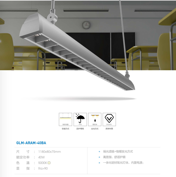 40W 偏光透镜+格栅发光方式,高显指,舒适护眼。