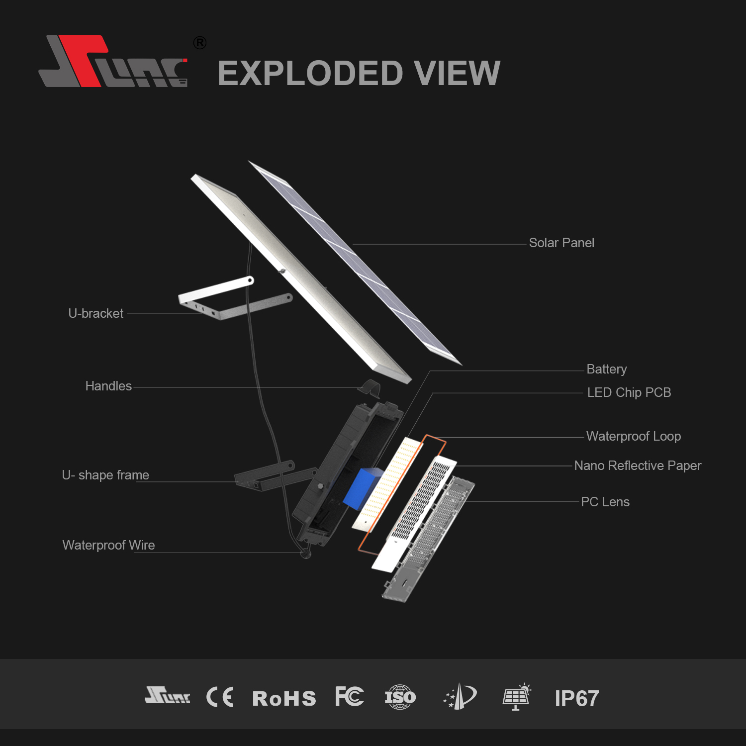 这是我们的专利产品,旨在为我们的客户提供高品质的太阳能泛光灯,通过ce, RoHS,FCC等国际认证。“免接线,安装方便”“特殊RGB音乐节奏”“充电效率高”“续航能力强”“光效突出”是我们的主要优势。灯具配有大容量锂电池,可吸收太阳能并通过太阳能电池板将其转化为电能。能量储存在电池中,然后供应给太阳能灯。可广泛应用于庭院、花园、公园、道路等区域。