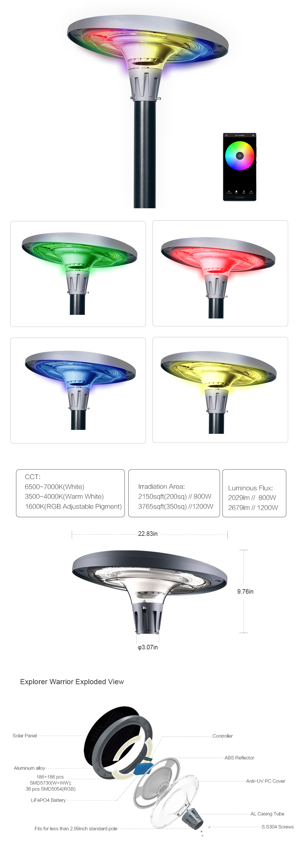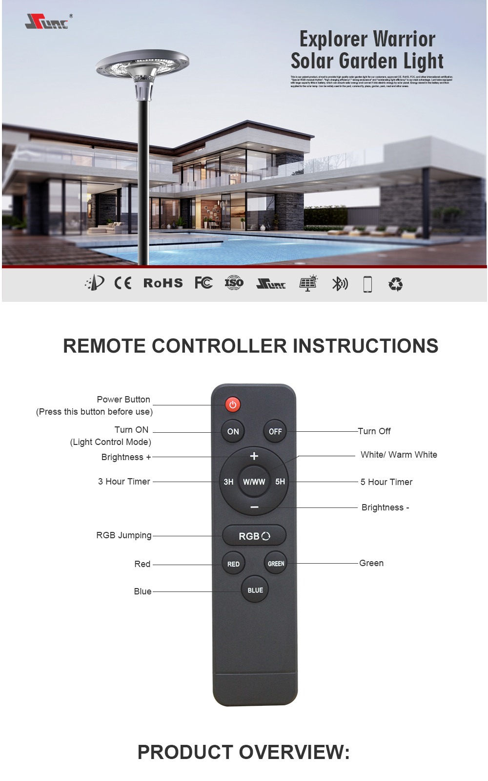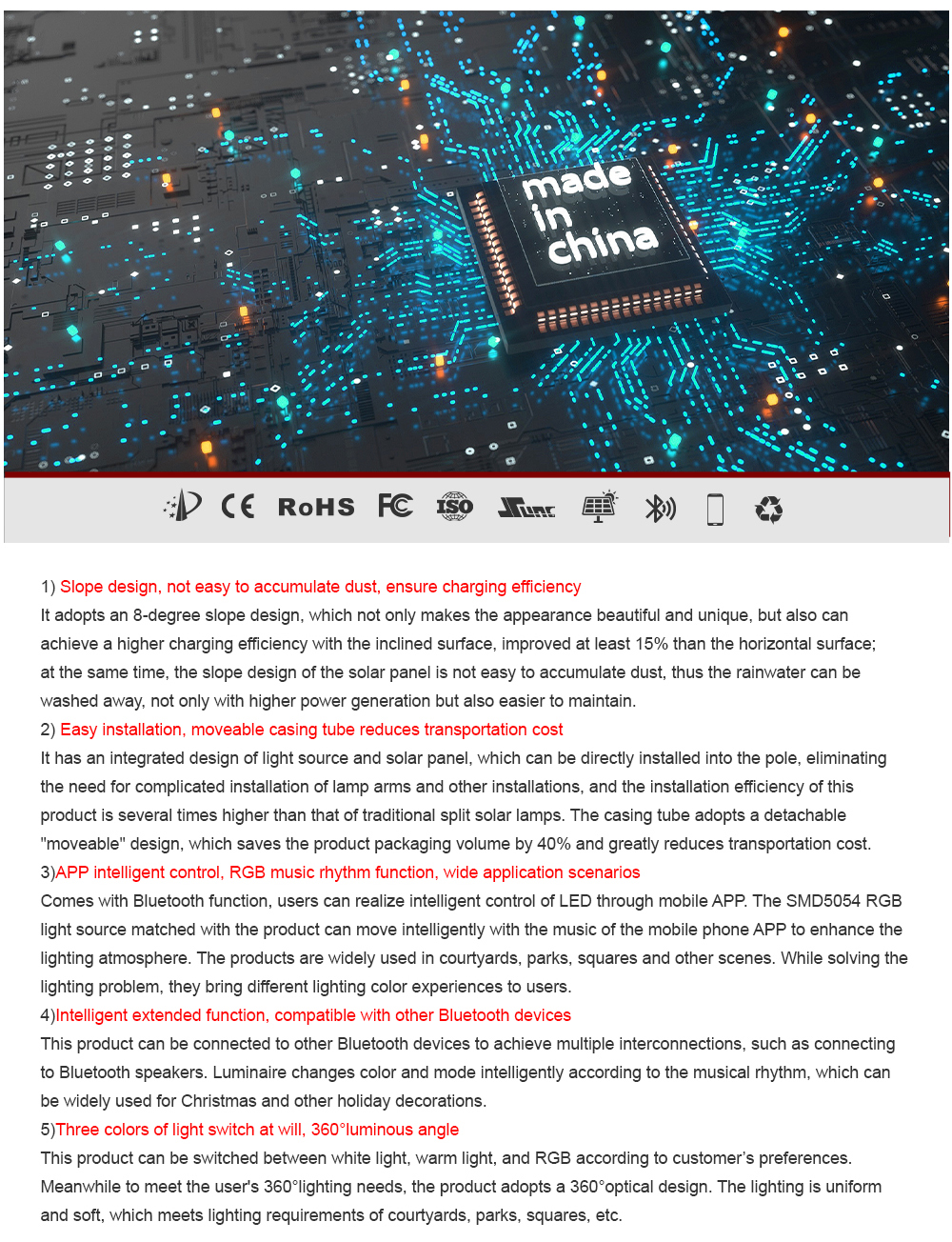This is our patent product, aimed to provide high quality solar flood light for our customers, approvedCE, RoHS,FCC,and other international certification. "Wiring free, easy to install" " Special RGB musicalrhythm", "high charging efficiency","strong endurance" and "outstanding light eficiency"is our mainadvantage.Luminaire equipped large capacity lithium battery, which can absorb solar energy andconvert it into electric energy by solar panel.Energy stored in the battery and then supplied to the solalamp.can be widely used in the yard,garden,park,road and other areas.