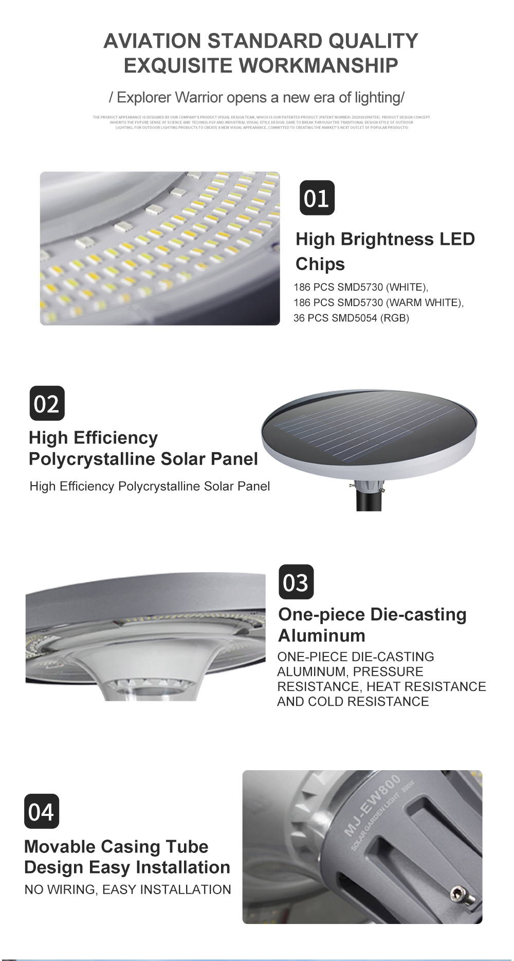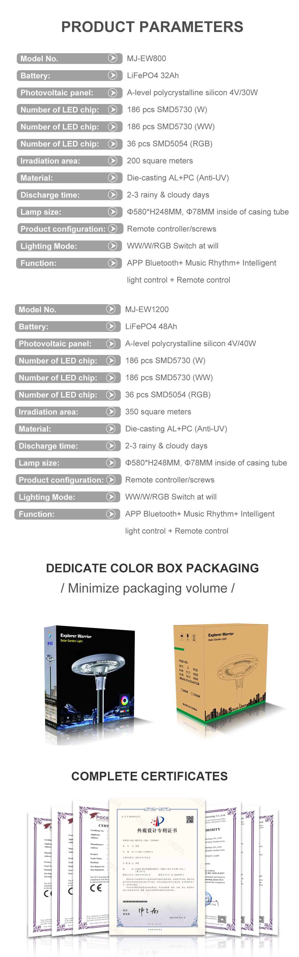 这是我们的专利产品,旨在为我们的客户提供高品质的太阳能泛光灯,通过ce, RoHS,FCC等国际认证。“免接线,安装方便”“特殊RGB音乐节奏”“充电效率高”“续航能力强”“光效突出”是我们的主要优势。灯具配有大容量锂电池,可吸收太阳能并通过太阳能电池板将其转化为电能。能量储存在电池中,然后供应给太阳能灯。可广泛应用于庭院、花园、公园、道路等区域。