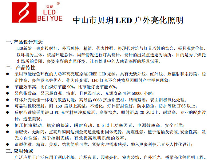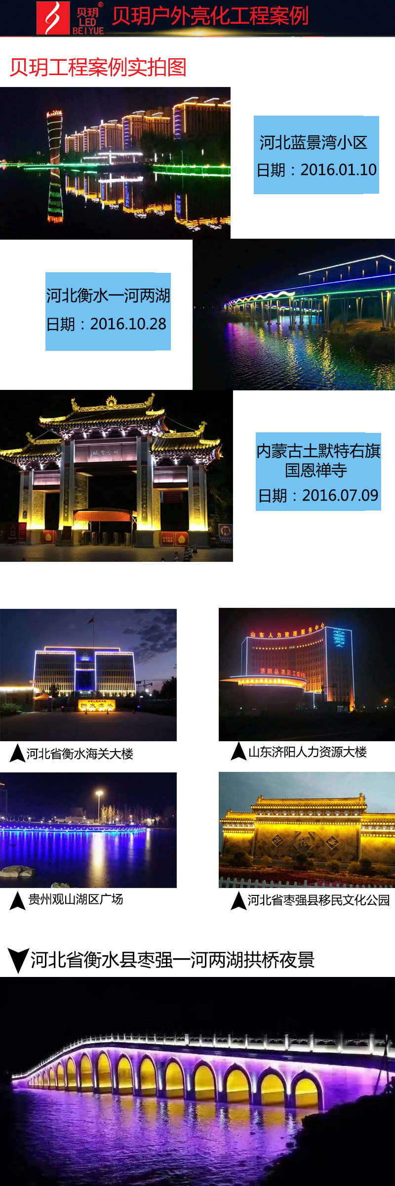 贝玥LED户外照明是一家生产及研发LED户外亮化产品并提供LED亮化LED工程生产,设计,承接、安装和维护的专业性LED照明企业。