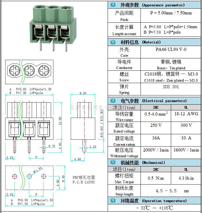 东莞市长河电子有限公司是集开发、生产、销售于一体的专业化的接线端子,端子台,端子,连接器,接插件生产厂家,并拥有一批高素质的管理队伍和技术精英,通过几年的精心经营,产品通过UL、VDE、CB、CQC、ROHS等多种认证,工厂已通过ISO9001:2000质量体系认证. 主要产品有: CA系列弹片式接线端子、CT系列升降式接线端子、CP系列插拨式接线端子、CS系列免螺丝压扣式接线端子、CK系列栅栏式接线端子、CZ系列贯通式接线端子、各种单双排插针及IC插座.常备规格有2.54 、3.50 、3.81 、3.96、5.00 、5.08 、6.35、7.50、7.62、8.255、9.525、10.00 、10.16、11.00、13.00mm。 长河电子占地面积6500平方米,具有多年的专业制造经验,技术力量雄厚,生产检测设备先进,拥有一流的现代化生产厂房和各种新型的全自动化装配设备,拥有一批“高效、专业、富有团队精神”的研发和管理队伍。 在公司的发展过程中,我们先后建立了研发中心、五金模具、塑件模具、注塑成型、装配成品等一系列部门。本公司严格贯彻、执行可持续发展和绿色环保理念,坚持质量、效益和环保全面发展。工厂于2004年顺利通过ISO9001:2000质量体系认证,接线端子先后通过UL、VDE、CB、CQC、ROHS等多种认证,为广大客户提供最严格的品质保障。 长河电子接线端子产品广泛应用于各种电子电器领域,例如照明灯饰、整流器、变压器、仪器仪表、IT通讯、报警装置、电梯设备、家用电器等领域。产品性能优良,服务周到,在国内外市场享有很高的声誉,远销世界20多个国家和地区. 接线端子专家-东莞市长河电子有限公司公司本着“诚信经营、优质服务”的经营理念,愿以与海内外客户携手合作,共同发展。