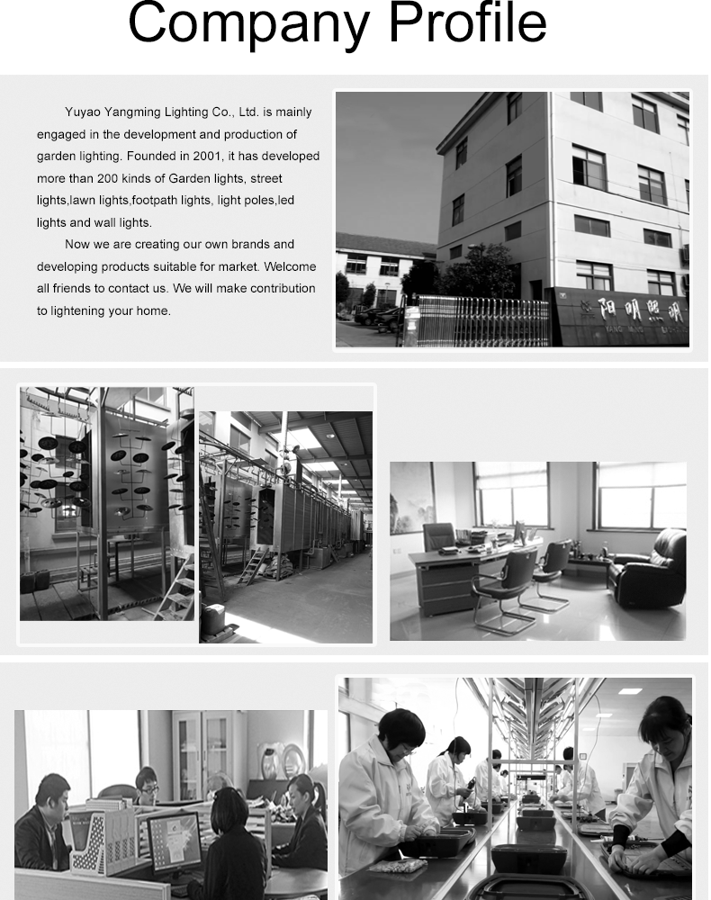 余姚市阳明灯具有限公司致力于专业园林照明的开发和生产。公司成立于2001年,已开发庭院灯、步道 灯、草坪灯、水下灯、壁灯六大系列,200余款产品。公司占地面积7000多平方米,建筑面积5000多平方米。拥有压铸、精密加工、表面涂装和成品总装一条 龙的制造流程。公司拥有专业的技术研发团队,经过多年的产品开发积累,已拥有多项专利技术。产品 面向国内市场,远销东南亚及巴西、墨西哥等20多个国家和地区。精益求精、铸就完美是每个阳明人的 共同追求的目标。公司正在努力创建品牌,不断开发市场需求的产品。余姚市阳明灯具有限公司欢迎各类顾客及业内人员 的光临、指导、合作。为美化、亮化我们的家园,作出应有的贡献。