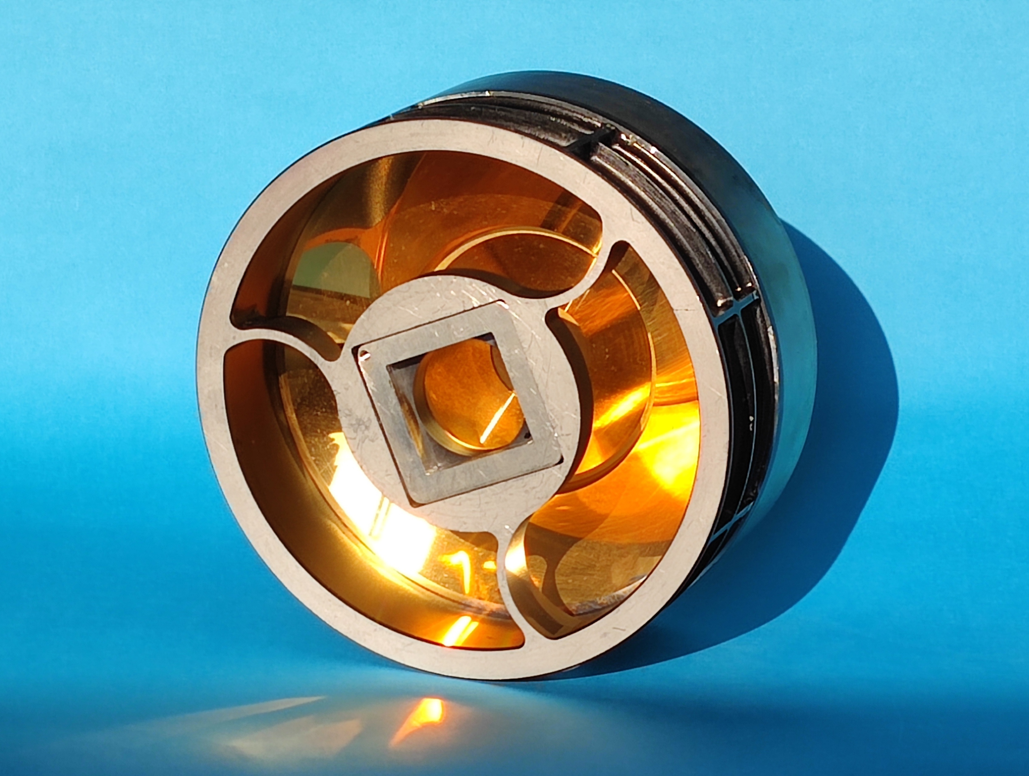 Optical Configuration/光学体统:Three-Mirror-Anastigmat Reflective Telescope Objective 三反射消像差望远物镜 Aperture/孔径:200mm Focal Length/焦距:200mm Focal Ratio/焦比:F/1.0 Field Of View/视场:2.6° Resolution For Visible Wavelength/极限分辨率:0.68arc seconds/0.68角秒 Operating Wavelength/工作波长: UV-Visible-FarIR (Matched coating)/紫外-可见光-远红外线 (配对镀膜) Working Temperature/工作温度:Cryogenic350°C/深冷至350°C Mass/质量:2000g 反射式望远镜以铝质M1+M3及M2反射镜为蜂窝轻量化结构,反射面及装配定位为一次性超精密单电金刚石加工, 工序少成本低. F/1.0相对孔径极为适合微光及高灵敏度探测光通讯传输机摄像应用场景.