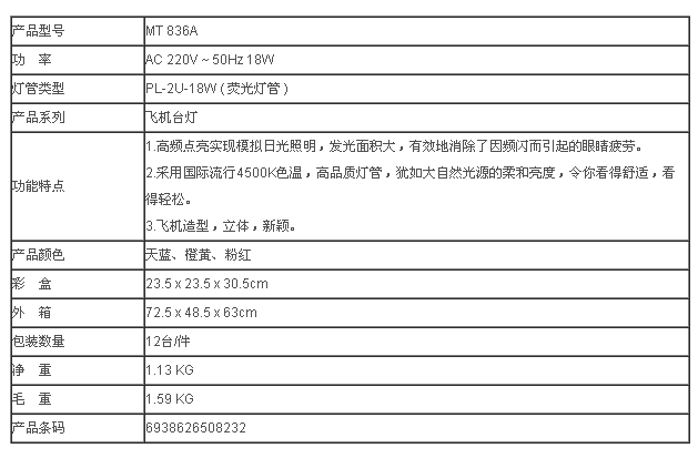 百利威 飞机系列 卡通造型台灯 MT836A 荧光灯管 18W
