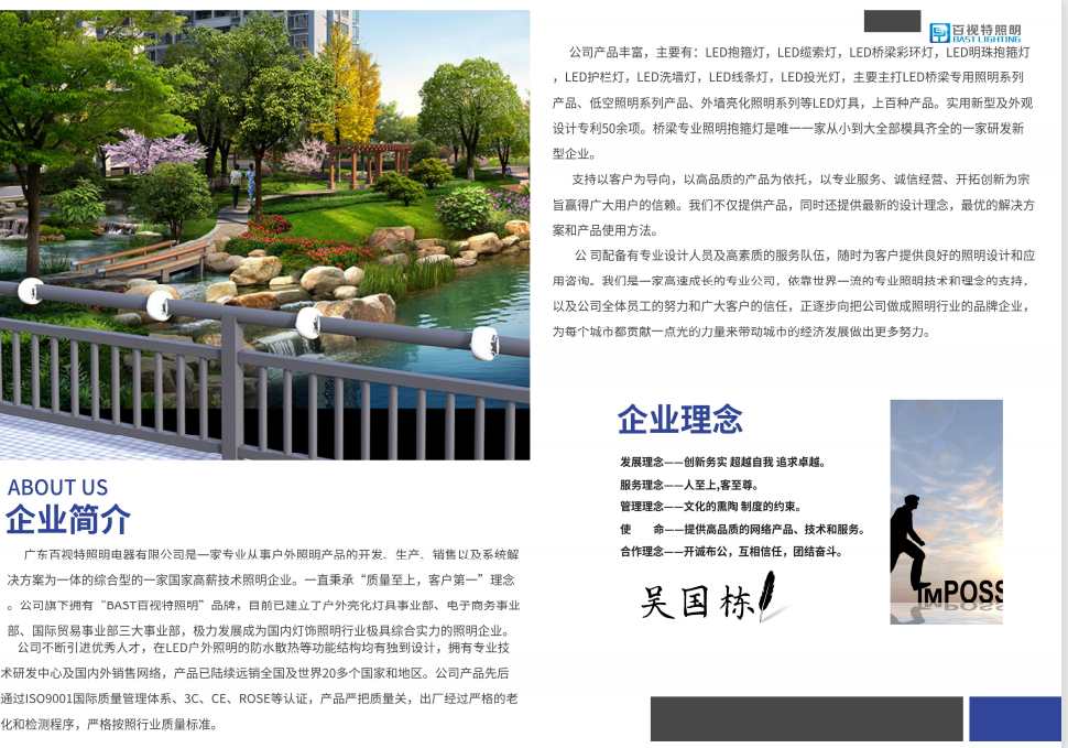 广东百视特照明电器有限公司是一家从事户外照明产品的开发、生产、销售以及系统解决方案为一体的综合型的一家国家高新技术照明企业。一直秉承“质量至上,客户优先”理念。公司旗下拥有“BSTU百视特照明”品牌,目前已建立了户外亮化灯具事业部、电子商务事业部、国际贸易事业部三大事业部,极力发展成为国内灯饰照明行业具有综合实力的照明企业。