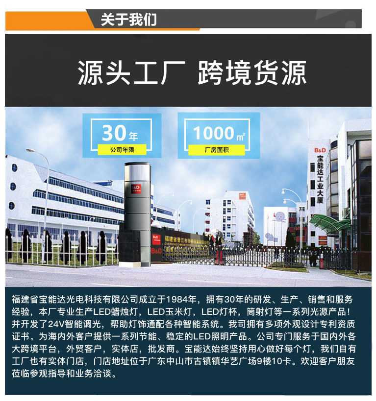 泉州市宝能达光电科技有限公司成立于2002年, 是一家专业从事LED照明应用产品的研发、生产、销售和服务的高科技企业。发展至今公司已拥有从LED封套到应用的全套技术,并自主研发生产了全系列的LED照明应用产品, 特别是在民用和商业照明领域, 如大功率LED球泡灯、LED灯管、LED MR16 射灯、LED蜡烛灯等。同时公司也聚集了大批半导体照明领域的高级科研人才,在大功率LED非成像二次光学系统、散热系统设计、电路系统设计等方面实现系列重大突破。 由于独特创新的产品发展模式和高效的公司管理体制使公司屡获中国政府的各种嘉奖。同时坚持推行ISO9001:2000质量管理体系、ISO14001:2004环境管理体系、SA8000:2001社会责任管理体系以求进一步提升公司的管理体制。为更方便客户了解我们的产品和进行业务合作,BD在香港,上海分别设立了分公司和产品展示厅,有专业销售人员全年度欢迎客户的 到访。