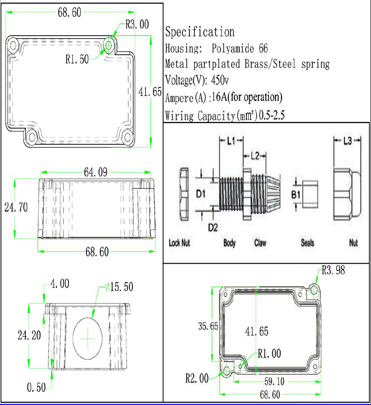 B705防水接线盒,可配套T04/T06/P02系列接线端子,防水防尘防晒,IP66防水等级