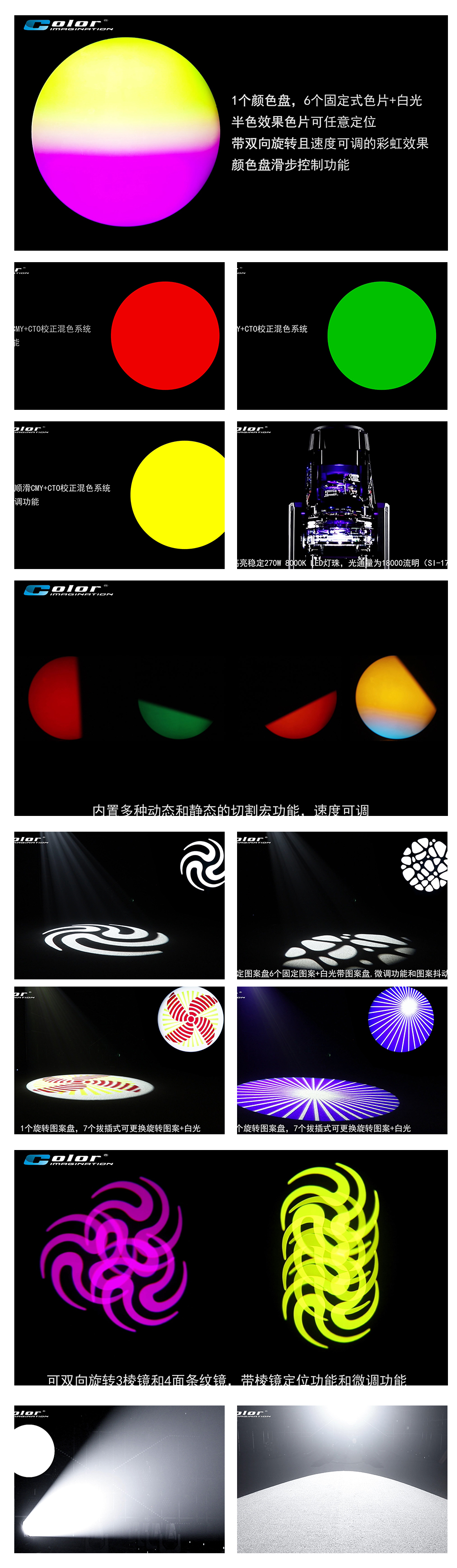 固定图案盘:6个固定图案片+白光(含1个光斑缩小图案和1个动画图案),带图案抖动功能