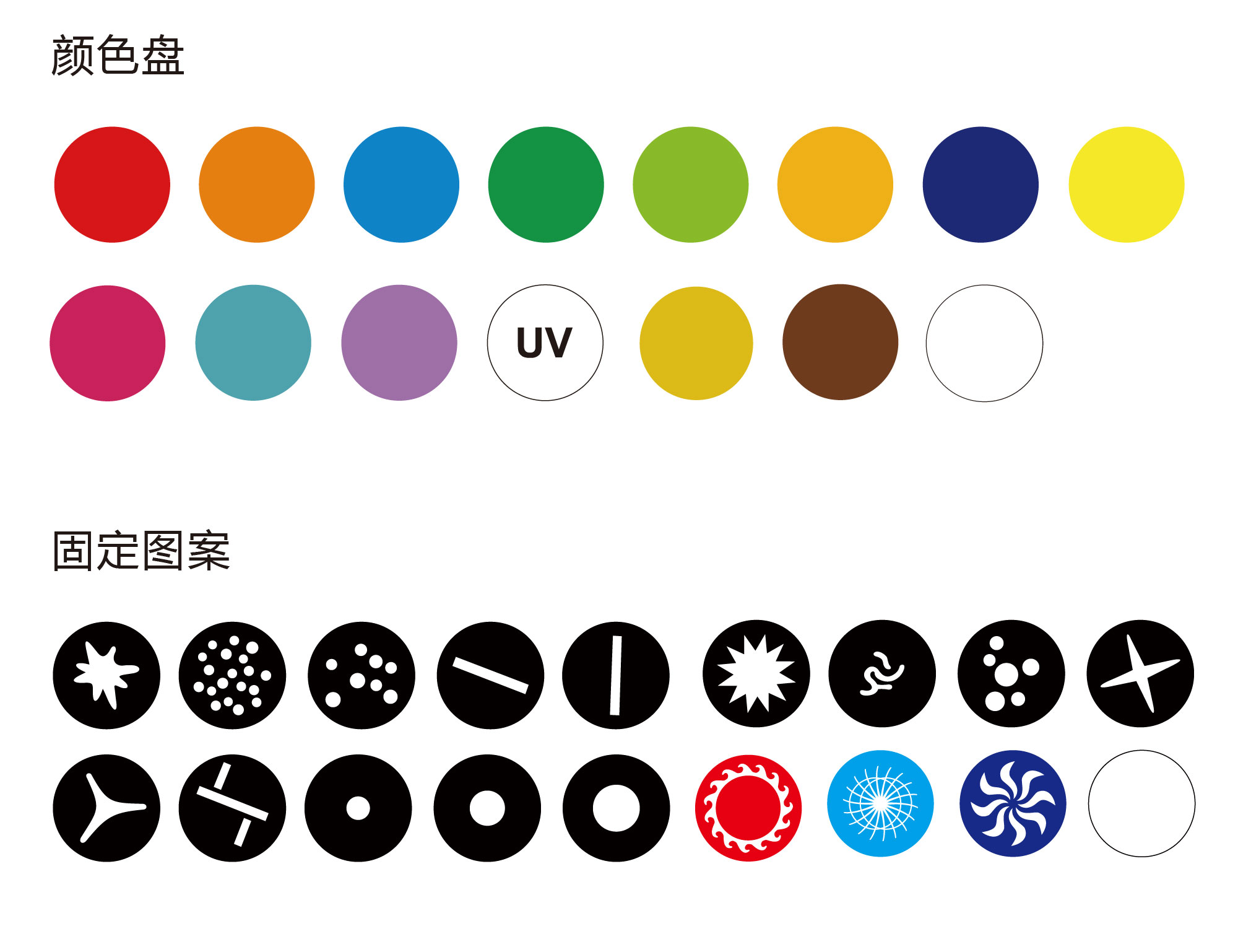 固定图案盘:17个固定图案片(含4种玻璃图案)+白光,带图案抖动功能