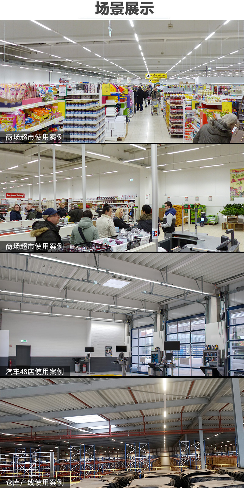 • 适用空间 工厂仓库、商超、汽车4S店、其它室内场所、家居、商业、酒店、餐馆、办公