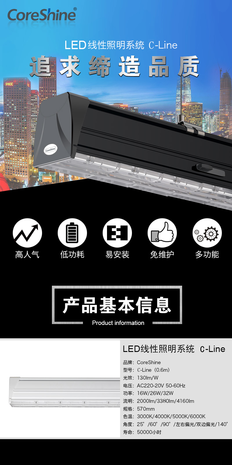 深圳市中光光电有限公司成立于2005年,是一家集LED照明产品的研发、制造、销售和服务为一体的高科技企业。公司拥有国内外领先的LED灯具开发技术和产品应用体系。优良的品质管理、专业的品牌运作策略和先进的生产制造设备, 开发出节能、环保和稳定实用性强的LED照明产品。我们的产品已畅销国内的主要市场并出口至美国,英国,韩国,法国,德国,西班牙,土耳其,东南亚,澳洲和非洲等多个国家和地区,受到了国内外客户的一致好评。 独创了LED线性级联商照解决方案,主要应用于商超、商业、仓库、工业及其他室内照明。产品具有高人气、低功耗、易安装、免维护、多功能等特色,中光光电LED线性级联照明系统不是几盏灯的简单组合,而是一套完整的照明解决方案。向用户提供一整套完善的场景照明服务! 中光光电采用世界先进的光照检测设备,生产实现自动化。我们不仅拥有世界级的研发设备,而且还拥有一批强大的高素质研发团队,能够在7天内为客户的OEM做好样品。公司大部分产品通过了欧盟CE认证,美国UL认证和德国GS认证等。 正是由于我们拥有强大的研发实力才保证了我们推向市场的每件产品都具有:可靠的质量、科学的配光、精美的外观和超长的使用寿命。并配备实施及时的售前、售中和售后服务。中光人致力于品牌的建立和维护,充分发挥企业的产品优势、服务优势、技术优势、市场优势、环保优势、管理优势和完善健全的宣传优势。使产品和服务更高的适合市场需求,以良好的信誉和可靠的质量走向LED照明领域的前沿。从而实现了产品特色化、市场国际化、业务全面化、服务专业化的发展格局。 公司以“信誉第一、诚信至上、服务一流”为企业宗旨,以市场为主导,以高新技术为依托,竭诚为LED照明市场提供更先进,更优质的产品和服务。 时值盛世华年,展望未来,信心百倍,目前我们正处在迅猛发展阶段,力争在2年内发展成为国际LED照明巨头。在此我们诚意相邀各界朋友在互利互惠的基础上,与新老客户一道携手并进,共创辉煌! 如果您是设计院的; 如果您是照明设计公司的; 如果您是建筑设计公司的; 如果您是展览设计公司的; 如果您是室内设计公司; 如果您是工程公司; ... ... 恰巧如果您也对我们的产品及服务感兴趣,欢迎联系?我们以便进一步的沟通了解!1、联系电话:0755-25577666 2、商业合作:business@coreshine.com (服务时间8:30-12 13:30-18:00) 3、关注微信公众号:中光光电 了解更多信息 官网:http://coreshinechina.com/