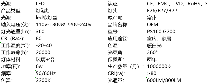 LED灯丝灯 球泡灯PS160/BT180/TT80/3.5K/G200 6w 琥珀色玻璃装饰灯