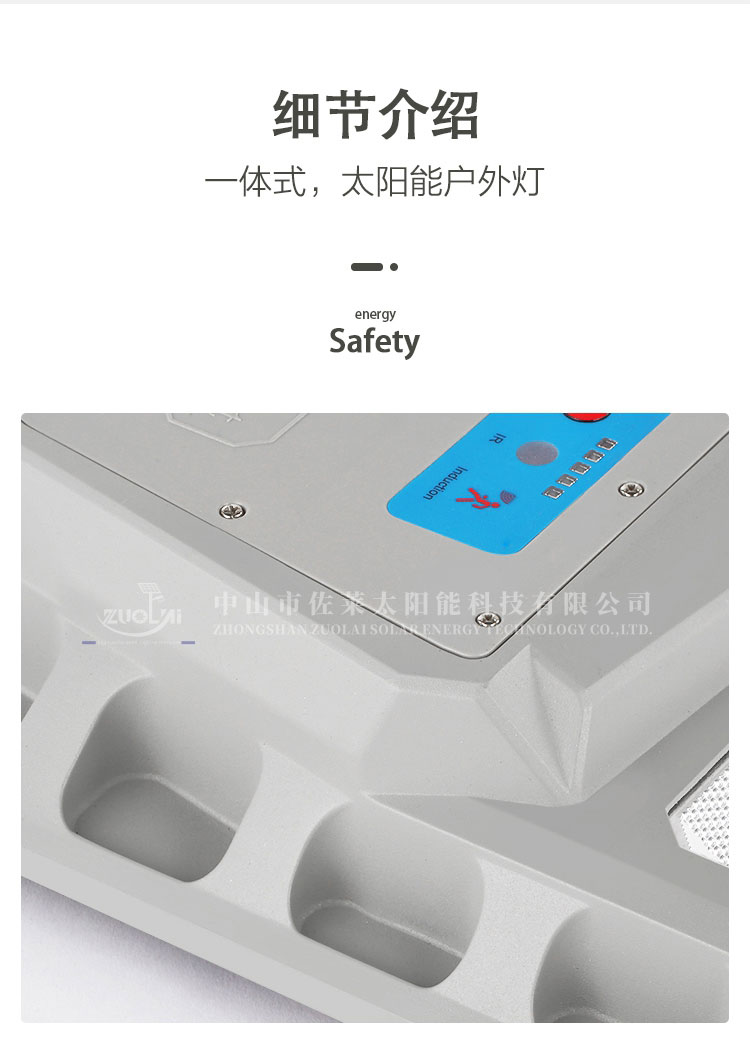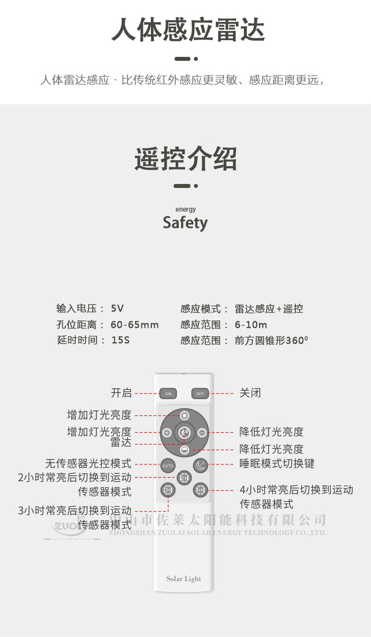 中山市佐莱太阳能科技有限公司成立于2014年,在太阳能灯具市场快速发展中,佐莱太阳能在其创始人的带领下,携专业工程设计师及技术团队一起从事太阳能照明的研发和研制工作。佐莱本着优质为先,博采众长,科技创新的经营方针,不断开拓太阳能与现代科技的结合,创造太阳能照明领域新境界。佐莱太阳能强调“使用价值”完善“专业服务”坚持“品质保障”产品传遍国内外。同时也为广大用户设计和生产OEM产品,佐莱太阳能是一家集设计,研发,生产,销售为一体的公司。