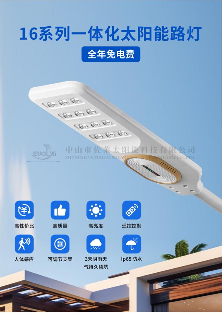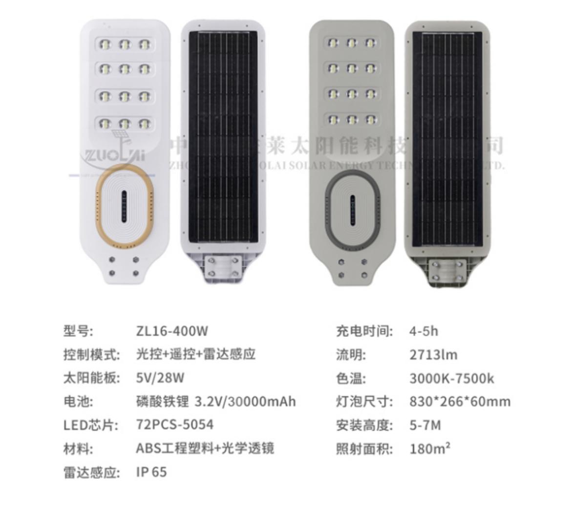 中山市佐莱太阳能科技有限公司成立于2014年,在太阳能灯具市场快速发展中,佐莱太阳能在其创始人的带领下,携专业工程设计师及技术团队一起从事太阳能照明的研发和研制工作。佐莱本着优质为先,博采众长,科技创新的经营方针,不断开拓太阳能与现代科技的结合,创造太阳能照明领域新境界。佐莱太阳能强调“使用价值”完善“专业服务”坚持“品质保障”产品传遍国内外。同时也为广大用户设计和生产OEM产品,佐莱太阳能是一家集设计,研发,生产,销售为一体的公司。