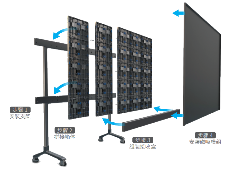 模块化设计,拼装更简易 LED会议屏在安装时只需将每一列箱体固定在底座上,再将接收盒 与磁吸模组连接即可完成,安装与维护方便快捷。