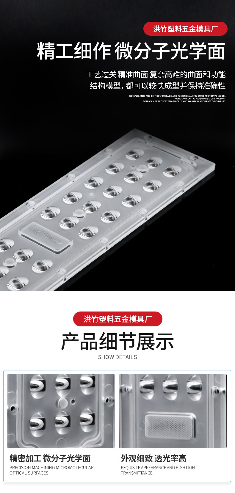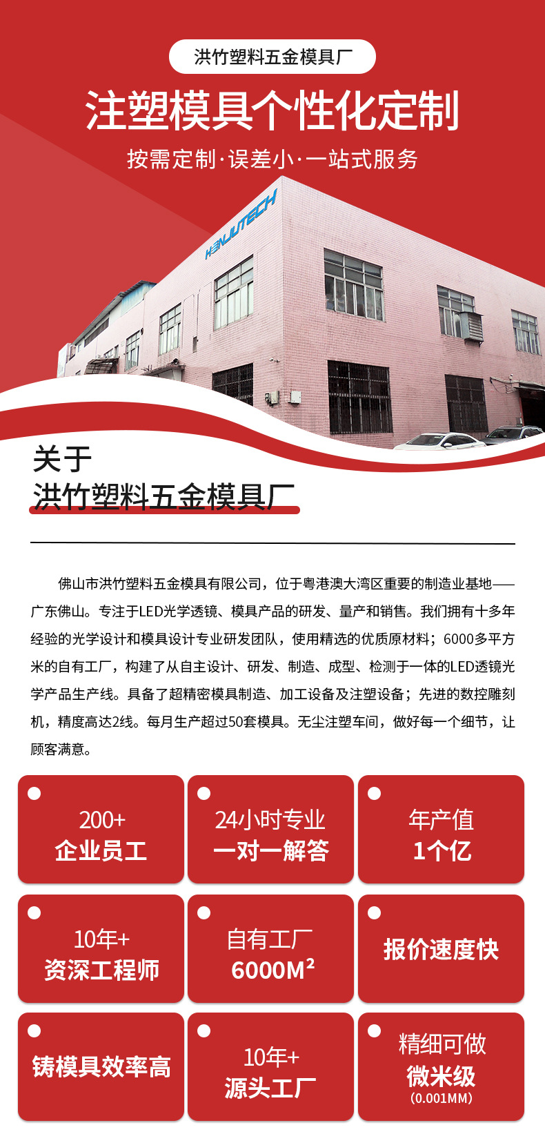 佛山洪竹塑料五金模具有限公司成立于2009年,位于粤港澳大湾区重要的制造业基地-佛山。 公司专业从事LED光学模具及光学透镜产品开发,生产及销售。拥有一支具有十年以上光学设计及模具设计的专业研发团队。具备一整套超精密模具制造设备、注塑设备和6000多平方米的注塑间,专业的光学实验室,构建了从自主设计、研发、制造、成型、检测于一体的LED透镜光学产品生产线。 洪竹人通过不断的发展与创新,在成长的过程中,不断地吸取同行业先进的注塑模具制造技术与管理经验。公司坚持品质卓越不断提高质量管理水平,始终满足客户不断变化的要求。并逐渐形成了自己完善的品质管制程序,以此达成客户对于产品高品质的要求。