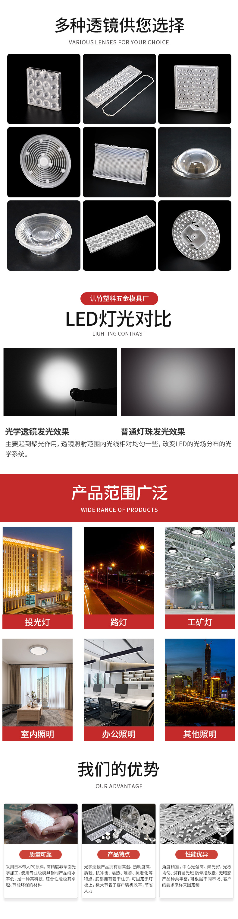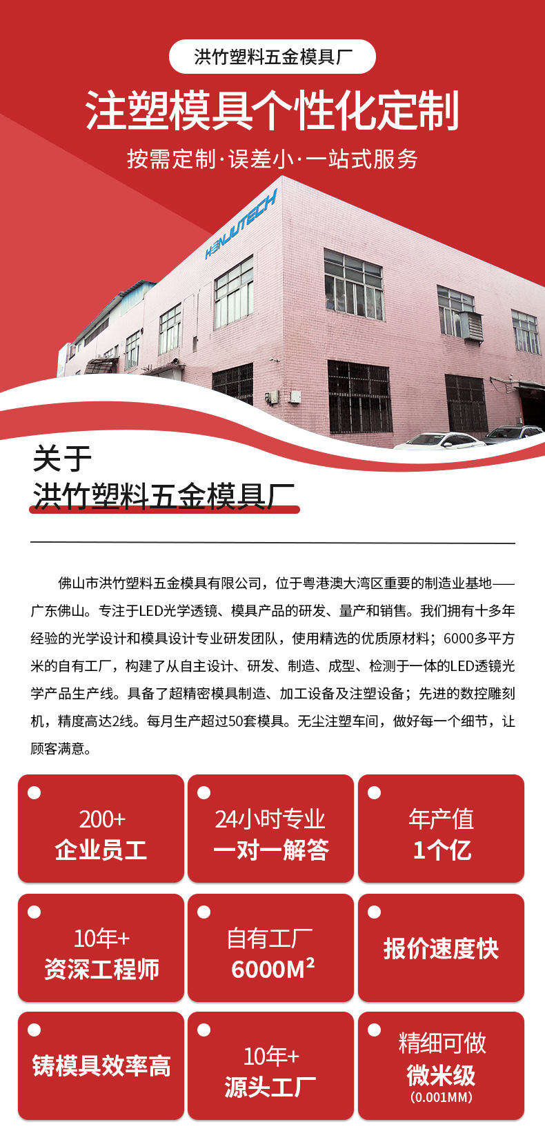 佛山洪竹塑料五金模具有限公司成立于2009年,位于粤港澳大湾区重要的制造业基地-佛山。 公司专业从事LED光学模具及光学透镜产品开发,生产及销售。拥有一支具有十年以上光学设计及模具设计的专业研发团队。具备一整套超精密模具制造设备、注塑设备和6000多平方米的注塑间,专业的光学实验室,构建了从自主设计、研发、制造、成型、检测于一体的LED透镜光学产品生产线。 洪竹人通过不断的发展与创新,在成长的过程中,不断地吸取同行业先进的注塑模具制造技术与管理经验。公司坚持品质卓越不断提高质量管理水平,始终满足客户不断变化的要求。并逐渐形成了自己完善的品质管制程序,以此达成客户对于产品高品质的要求。