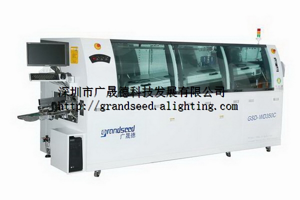 LED全自动波峰焊机技术参数控制方式:电脑+PLC( 广晟德PCBASE波峰焊控制软件V1.0)运输马达:1P AC220V,60W运输速度:0~2000mm/min基板尺寸:30~350mm(w)助焊剂容量:6L预加热区:1800mm三段控制,立运风,室温~250℃锡炉加热:1KW * 10PCS 室温~300℃锡炉容量:350KG波峰高度:0-12MM波峰马达:3P AC220V,0.18KW * 2PCS洗爪泵:1P AC220V 6W运输方向:左→右焊接角度:3 ~ 6 o助焊剂气压:3 ~ 5 BAR电源:AC380V 50HZ正常运行功率/总功率:8KW/25KW外形尺寸:4300(L)*1400(W)*1700(H)机身尺寸:3400(L)*1400(W)*1700(H)净重:1180KGLED全自动波峰焊机GSD-WD350C预热系统特点■PID控温精确、可靠,进口热电偶检测系统,做有热电偶异常报警功能。■预热系统采用远红外陶瓷发热管三段预热控制系统,能提供广泛充足的预热调整空间,可消除PCB上大元器件焊接不良的现象,适应型低固体残留免洗松香型助焊剂; 3段预热补热自动调整系统,减小PCB板多次冲击PCB板受热均匀。■采用台湾台展发热体,发热快、寿命长、热惯性小;采用远红外陶瓷发热,均匀地将热量送PCB底部,温区温度均匀致,各温区温度互补,深沟现象。■预热系统采用模块化设计,便于维修与清洁保养,内充硅酸铝保温材料,预热区在设定温度为140℃的情况下,外部表面温度在50℃以下,增强保温效果,减少了耗电量。LED全自动波峰焊机GSD-WD350C焊接系统特点■PCB板进入锡炉焊接区,自动开始焊接,焊接完毕后自动停止波峰。(专利号:ZL 2010 2 0056206.3)■锡炉铅环保立设计,升降与进出,方便安全,便于清理。■锡炉采用优质进口不锈钢制做,硅酸铝保温材料保温,炉内温度270℃的情况下炉外温度≤60℃,保温效果佳,安全性高。■3MM厚铅不锈钢材料,耐高温耐腐蚀,适应铅工艺,寿命长;标配个炉胆。■锡炉采用5面发热方式,加热升温快,设计自动开/关机时间,锡炉升温时间70分钟即可生产。■锡炉采用进口高温马达,变频调速,立控制,波峰性能稳定。■锡炉加热采用高速PID外热式两段立控制,升温迅速,解决了锡炉暴锡的缺点。■锡炉喷嘴可根据你要过的PCB板的宽窄进行调整,减少了效焊接区的面积,使焊锡与空气接触面积保持小,大大的减少了焊锡的氧化量。锡条含杂质不同锡渣约有偏差。适合Sn/Ag/Cu、Sn/Zn、Sn/Cu各种铅焊料,锡渣氧化量每8小时在0.8-2.0KG以内(根据PCB板的 大小而异)■增加导流槽和防氧化套,减少黑粉和豆腐渣状氧化物。锡炉设计合理,锡渣自动汇集.清理锡炉简单、方便、安全,不用天天捞锡渣,可根据情况周或更长时间清理一次。