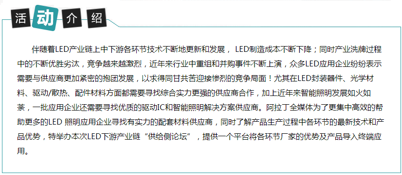 据悉,大会得到了业内空前热烈的响应。一方面照明灯具企业亟需借此机会寻找有实力的配套材料供应商,进行战略合作,抱团发展;同时,了解产品生产过程中各环节的最新技术和产品优势,与供应商形成战略合作,缩短研发时间,降低生产成本和构建自身竞争力。