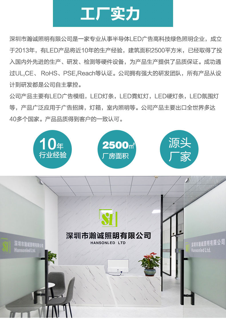 深圳市瀚诚照明有限公司成立于2010年3月是一家集设计、研发、生产、销售、工程服务为一体的高新企业。公司发展至今,厂房面积1500平米,拥有行业内最先进最齐全的全自动快速组装流水线。公司已经通过CE,RoHS,FCC,PSE等国际认证。公司拥有强大的研发团队,通过客户的需求来定制产品。公司主要专注于LED广告类产品,产品主要有LED模组,LED软灯条,LED灯条,产品广泛应用于广告灯箱,标识指示牌,户外亮化等。公司产品主要以出口为主,产品已经出口到国外几十个国家,产品品质已得到国外客户的一致认可。