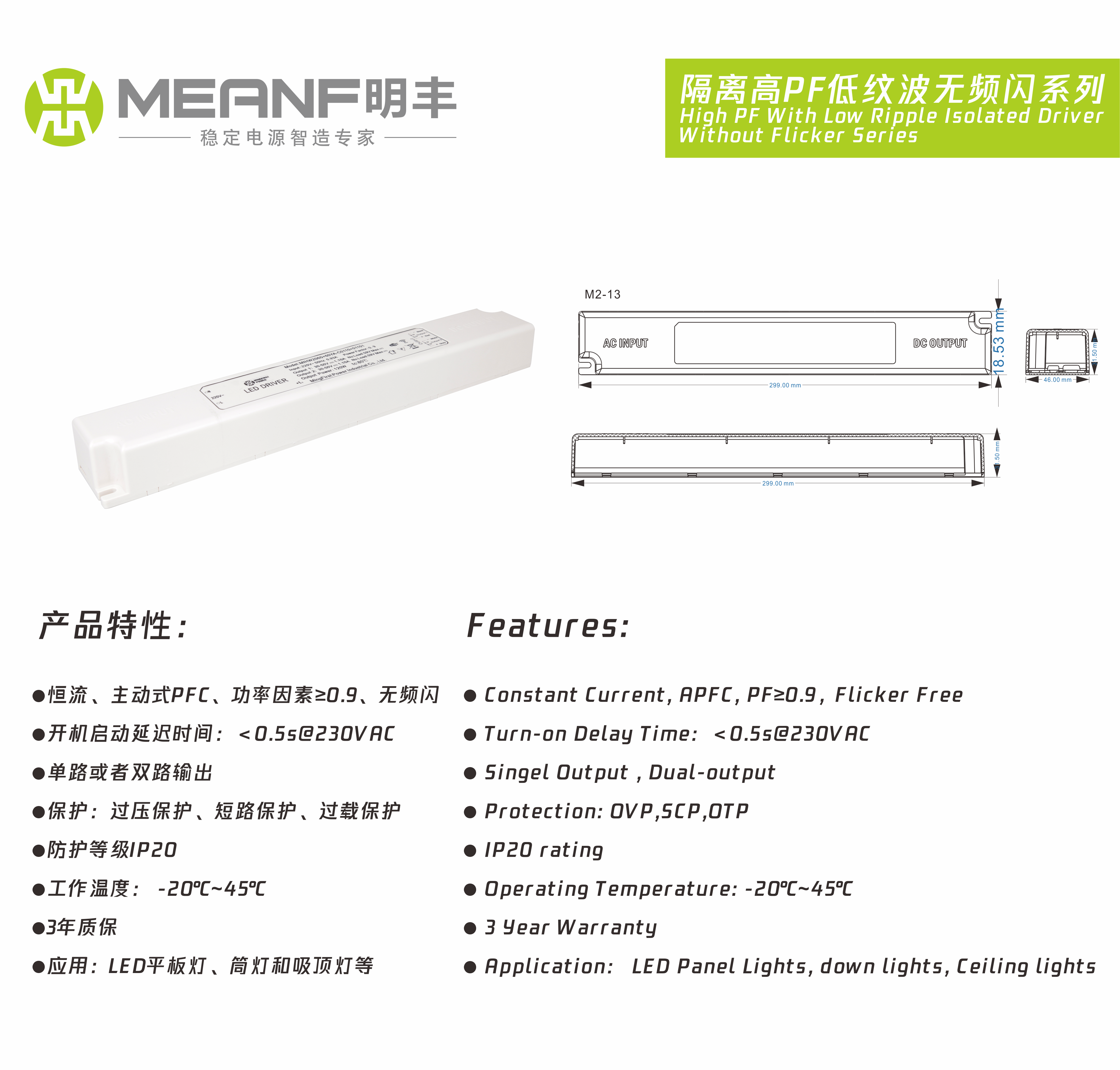 | 25-36W | MIHN2036YB-CXXXX1 | 220-240VAC | 0.9 | 20-32V | 750-1100 | 87% | 140*46*29 | TUV/SAA/CB/CCC |