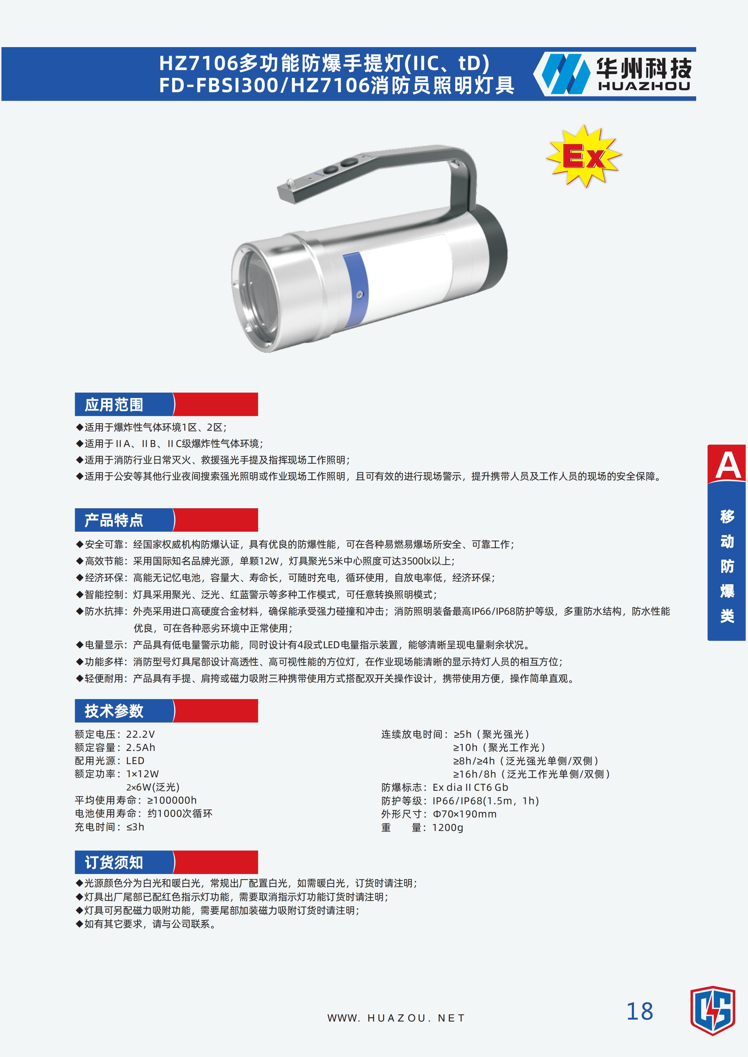 续航时间:强光≥5h;工作光≥10h; 使用温度:-20℃~+40℃ 储存环境:-20℃~+40℃ 防爆标志:Ex d ia Ⅱ CT6 Gb 防护等级:IP66/IP68 外形尺寸:Ф73x183mm 产品重量:1230g 产品描述:HZ7106A多功能防爆手提灯采用国际知名品牌光源,采用一颗12W进口LED光源,可通过开关控制实现强弱转换;灯具采用聚光、泛光、红蓝警示等多种工作模式,可任意转换照明模式;四段式电量显示,尾部设计有方位灯,满足各种工作需求。
