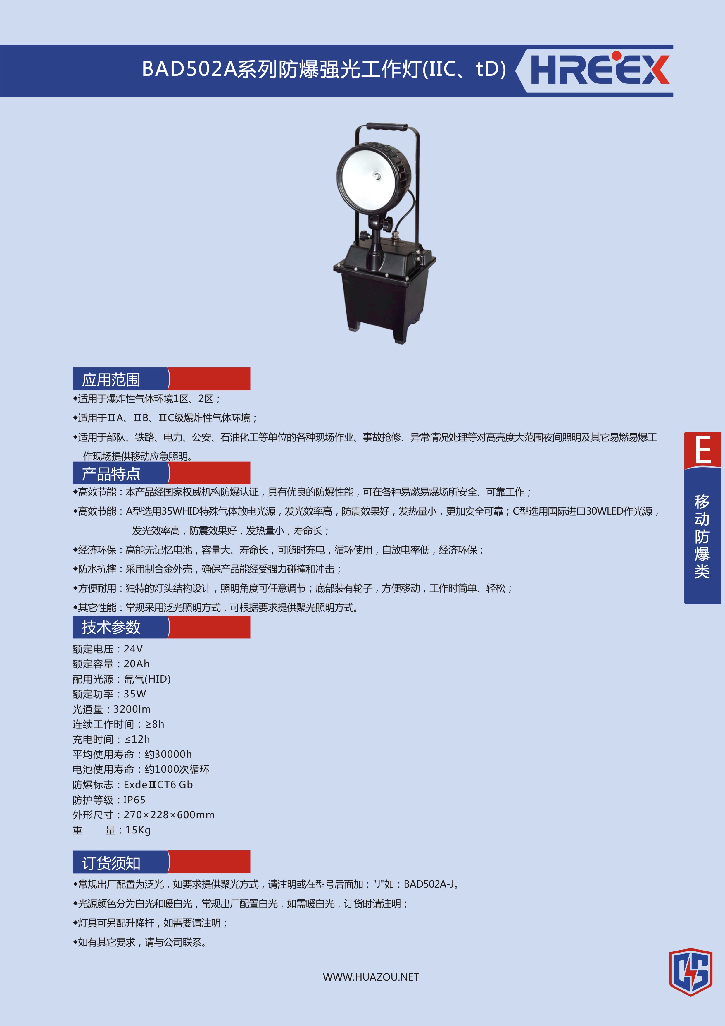 品牌名称:华州科技 产品型号:BAD502A 防爆标志:ExdeⅡCT6 Gb 防护等级:IP65 额定功率: 35W 外形尺寸:Ф270x228x600mm 产品重量:15kg 产品描述:BAD502A强光泛光工作灯采用铝合金外壳,确保产品能经受强力碰撞和冲击;底部装有轮子,方便移动,强光可连续点灯8小时以上,工作光达到16小时,完全满足了各类作业工作照明时长的需要;适用于石油、石化、船舶、电力、冶金、工矿等行业防爆区域作大范围移动照明及作事故抢修、户外施工照明。