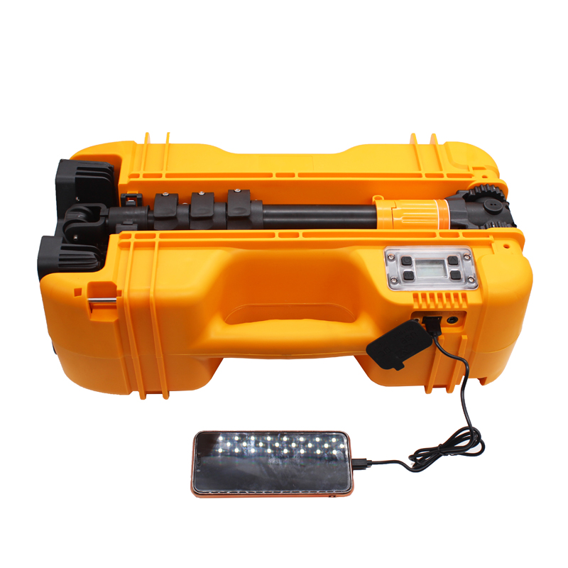 ◆轻便耐用:灯具体积小、重量轻,可以实现手提、背行两种携带方式。灯具也可以安装铁轨轮,方便用户在铁路单轨上移动; ◆科学配光:灯头组件由配光透镜、散热壳体和光源板组件等部分组件,光源板采用高光效LED光源,照明亮度高,覆盖范围大,使用寿命长; ◆升降性能:灯具采用可调节高度的四节伸缩杆来实现灯头高度的调节,最大升起高度为1.5米灯头可以在水平方向做一定角度(0-340°)水平旋转,也可以在垂直方向上做一定角度(0-160)的垂直翻转,满足用户不同角度的照射要求; ◆安全可靠:灯具采用各种优质材质制作,结构紧凑,质量稳定,性能可靠,能在恶劣环境和气候条件下正常工作。 ◆续航持久:采用大容量高能锂电池,容量大,自放电率低,一次充满电后可满足8小时的照明需要。并有防电池过放和短路保护功能,使用安全可靠; ◆功能多样:灯具功能多样,更具人性化。集聚光/泛光照明、电量显示、无极调光、信号警示等功能,满足用户不同环境下使用的需求采用标准USB充电接口,可为大部分手机等数码产品充电,解决用户在户外作业时手机或其他数码产品电量用尽无法使用的烦恼; ◆充电方便:可通过灯具配备的锂电池充电器(输入AC220V,输出DC21.6V/2.8A)灯具进行充电,可满足长时间照明需求。 技术参数电池额定电压VDC21.6 额定容量Ah13 电池使用寿命次约1000(循环)光源额定功率LED光源W35 光通量聚光+泛光LM2625 聚光LM1644 泛光LM2354 照度值(2米)聚光+泛光LuX/ 聚光LuX/ 泛光LuX/ 续航能力连续照明H≥8 平均使用寿命H100000充电时间H<6防护等级/灯头 IP65 箱体 IP54产品尺寸mm升起状态 510×290×1500收缩状态 510×290×220产品重量kg≤8 |