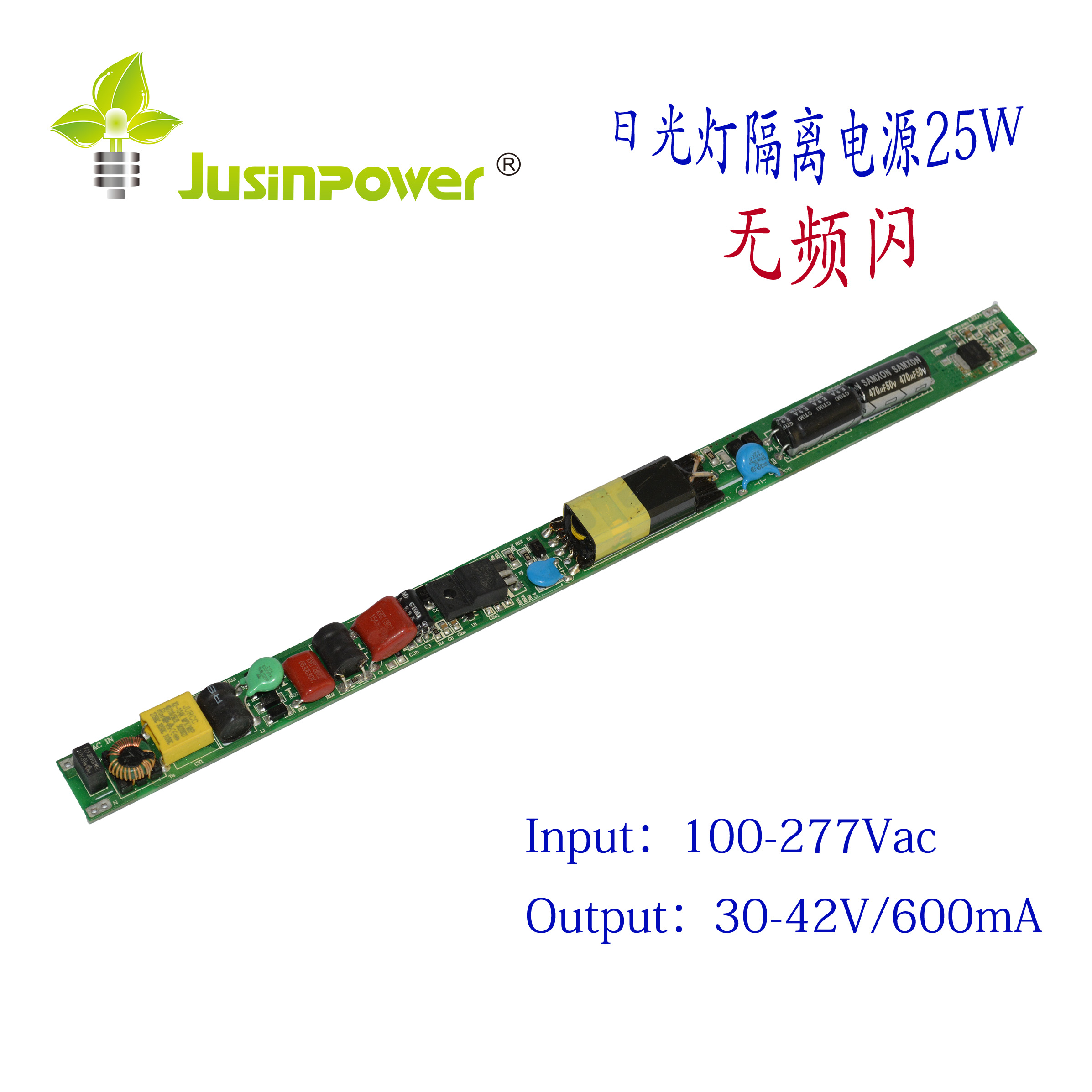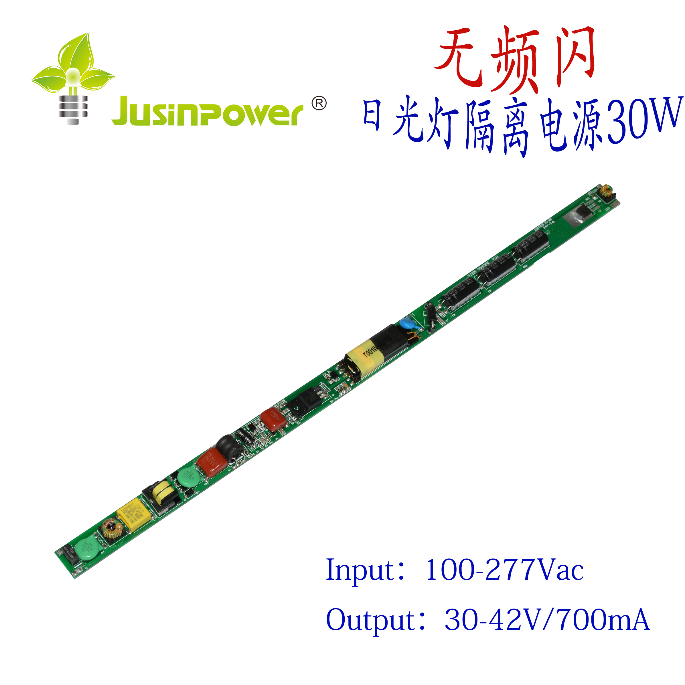 本产品适用于3528、3014、5050,2835等LED灯珠制作的10-12串联的T8,T10日光灯管.JUSINT001YW采用宽电压100-277Vac设计,最大输出功率36W,高稳定,高可靠,具有短路,过流、开路保护功能。单极PFC拓扑+无频闪模块结构设计,恒流精度±3%,谐波电流THD<10%,符合EMC,CE,UL认证,已配合灯具厂家拿到证书。矽力杰方案,万裕GT7000小时电解1.电源参数:输入电压:100-277Vac输出电流:≤880mA(可按客户要求调整电流)输出电压:30-42V(在功率设计范围内自动调节)输出功率:≤36W工作效率:≥85%功率因数:≥0.95恒流精度:±3%串联方式:10-12PCS外形尺寸:207*17.2*10mm2.功能特点:兼容:可兼容电感整流器。认证:本系列产品已获通过EMC,ROHS认证。开路保护:输出端无负载开路时,输入端正常输入,产品不会被损坏。短路保护:如果输出端出现异常,造成输出正负极短接,本产品会启动短路保护功能,不致因为此异常造成永久性伤害。过载保护:本产品恒流设计,负载在设计范围内,输出电流会恒定不变,当输出端负载超出设计范围,本产品进入两种保护状态:输出端电压过低,本产品进入频繁启动和关断的保护状态,使用者会看到LED会出现闪烁;输出端电压过高,本产品进入恒压保护状态,使用者可以测试得到,此时LED发光强度会变弱,电流无法达到设计值。3.产品测试报告:4.公司简介: 深圳市聚鑫德源科技有限公司是专业研发,生产及销售LED驱动电源高新技术企业,目前在台湾设有办事处。 一、发展历程简介:2005-2010年:LED电源芯片的研发(次级恒流芯片A433)与应用(士兰微系列,矽力杰系列)2011年:LED日光灯电源批量投产 隔离与非隔离;2012年:首家推出业内首家开发2.4M大功率日光灯电源;2013年:成功开发并量产谐波小于10%的驱动电源;2014年:日光灯堵头电源全系列量产。2015年,1-10V电阻PWM调光电源研发投产,数字可控硅电源,应急电源投产。二、规模:厂房面积1200平方米,员工人数50人,研发人数5人。自主SMT生产线,DIP生产线,全自动老化。完善的检测,生产,老化设备。三、产品:主要用矽力杰方案,万裕7000小时电解,为客户定制电源,主要有: 1.常规日光灯隔离和非隔离电源系列 2.1-10V电阻PWM调光外置电源3.外置隔离和非隔离电源系列 4.可控硅电源系列 5.非隔离堵头电源系列6.智能控制电源系列