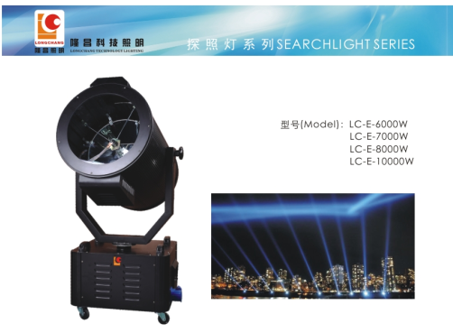 LC-E-9000W叹息道空中玫瑰是一种球形高压氙气光源的灯具。灯体采用优质铝合金制成,具有较强的耐腐蚀性,结构轻盈,性价比高。外表面整体喷塑处理,使用寿命长。灯体的保护玻璃采用厚的钢化玻璃,具有牢固的抗击强度。型号:隆昌LC-E-9000W名称:空中探照灯电压:AC220V/380V,50HZ/60HZ功率:9000W光源:上海球形氙灯,色温6000°K抗电强度:1.5KV绝缘电阻:2MW光束角度:0.6-0.8°可调颜色:白,黄,蓝,绿,红任选。控制模式:自动单机模式调焦范围:0.005-10公里无级调节水平角度:常规90-110度,垂直仰角在130度可以用手调节,可以定做180度—360度,同步功能。防护功能:IP65包装:木箱包装应用场合:可用于广场、公园、高层建筑、城市亮化、江河沿岸的空中大场面造景。
