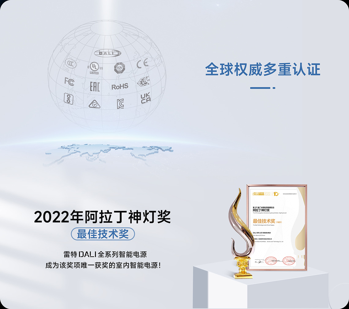 DALI协议(数字可寻址照明接口)是国际标准的照明控制通信协议,具有整体、分组调光、寻址调光、多种情景模式设置等强大的调光功能。雷特是DiiA联盟全权会员,参与DALI协议标准的制定,DALI调光系列产品研发起步早,技术成熟,产品齐全,遵循IEC62386/IEC60929 标准,可与任何符合DALI 协议的设备同接在一条总线控制;旗下DALI驱动产品均通过DALI-2标准测试认证,可在DiiA联盟官网产品数据库中查询。