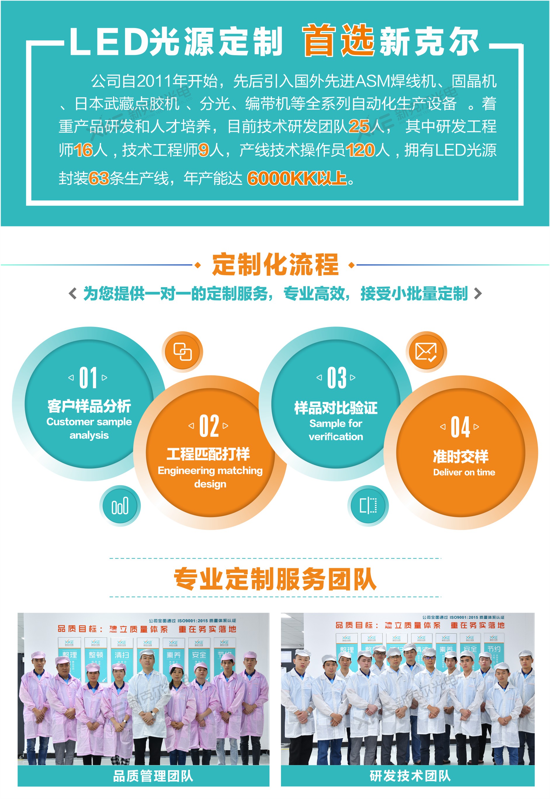 东莞东莞市新克尔光电科技有限公司 成立于2011年,位于东莞市石碣镇联兴路翱翔科技园, 是一家专业从事高端LED光源研发 、生产、销售和服务为一体的高新技术企业。公司拥有高精密共晶机、X-Ray、喷粉机、ASM焊线机、日本武藏点胶机等世界一流的生产设备和经验丰富、创新务实的研发团队,通过了IATF16949、ISO9001:2015、CE 、美国能源之星LM-80、RoHS、EN62471等多项国际品质认证。 LED高端光源定制设计是新克尔主力研发追求方向,主要产品有应用于车辆照明;UV紫外杀菌/固化;植物照明辅助生长;影视摄影补光调光等光源。全部采用三安 、晶元、隆达等原厂芯片封装,科学管控生产各个环节,出厂前每个批次均通过260度回流焊、24小时老化测试,性能稳定 , 质量可靠 , 具有高光效、耐高温、低光衰 、光色一致性好等特点,为客户提供一对一定制服务,与客户共同研发解决方案。新克尔秉承“信义、精湛、感恩、利他”的经营理念,不断占领LED封装技术高地 , 践行匠心、铸造精品 , 努力成为LED贴片定制光源领域,技术高精尖,服务一流的制造商。 热诚欢迎各界朋友前来参观、考察、洽谈!