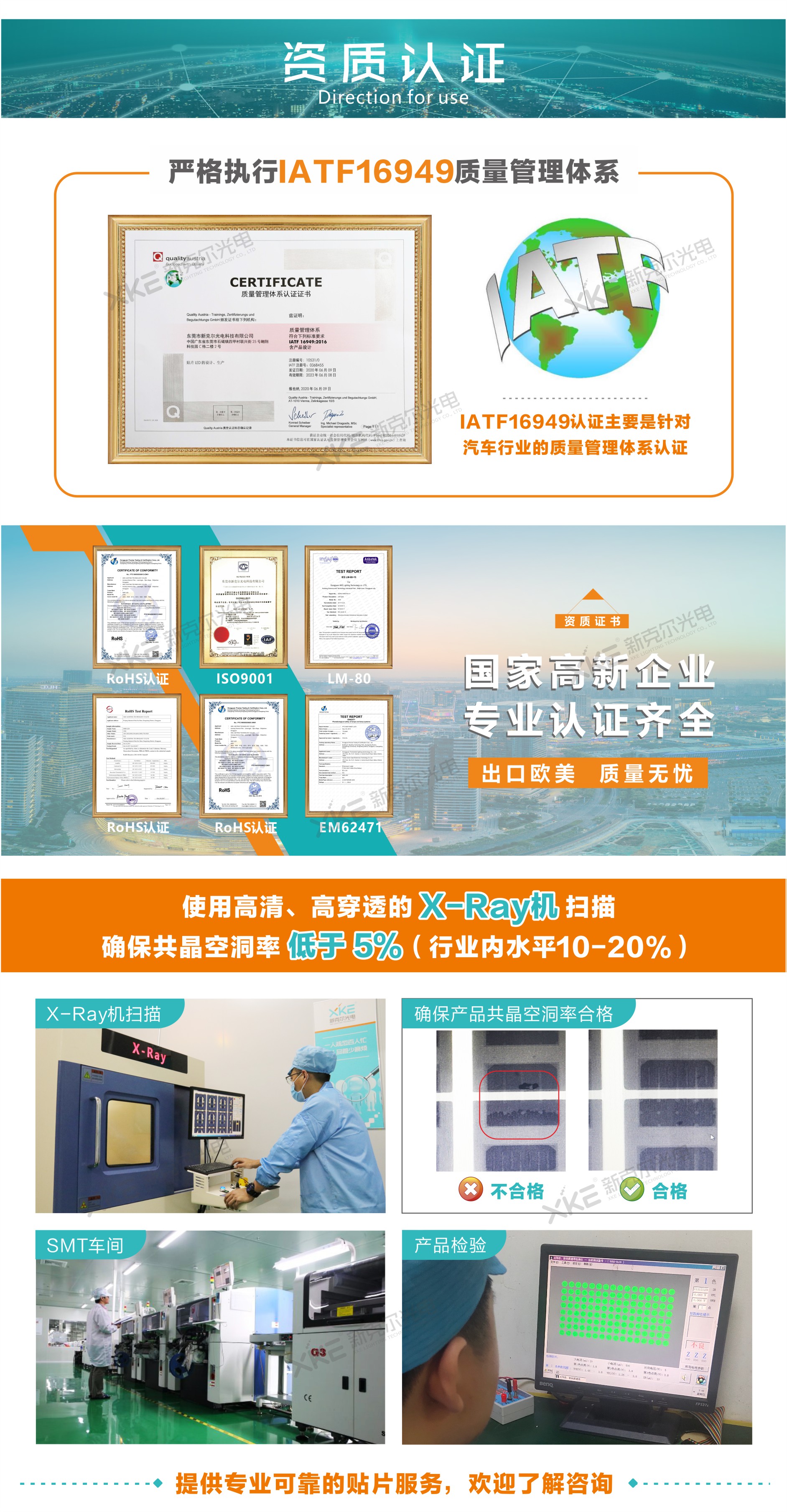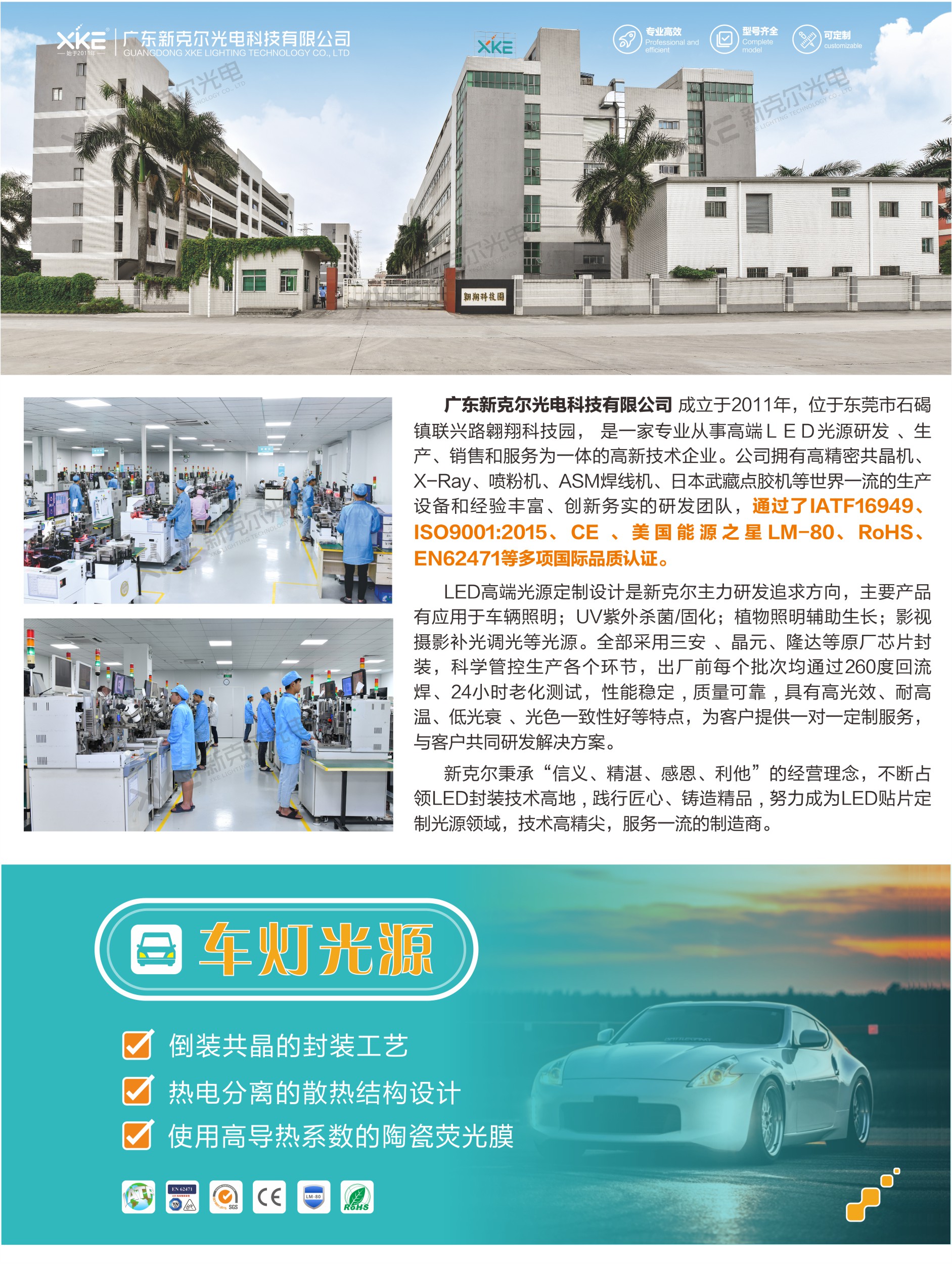 东莞东莞市新克尔光电科技有限公司 成立于2011年,位于东莞市石碣镇联兴路翱翔科技园, 是一家专业从事高端LED光源研发 、生产、销售和服务为一体的高新技术企业。公司拥有高精密共晶机、X-Ray、喷粉机、ASM焊线机、日本武藏点胶机等世界一流的生产设备和经验丰富、创新务实的研发团队,通过了IATF16949、ISO9001:2015、CE 、美国能源之星LM-80、RoHS、EN62471等多项国际品质认证。 LED高端光源定制设计是新克尔主力研发追求方向,主要产品有应用于车辆照明;UV紫外杀菌/固化;植物照明辅助生长;影视摄影补光调光等光源。全部采用三安 、晶元、隆达等原厂芯片封装,科学管控生产各个环节,出厂前每个批次均通过260度回流焊、24小时老化测试,性能稳定 , 质量可靠 , 具有高光效、耐高温、低光衰 、光色一致性好等特点,为客户提供一对一定制服务,与客户共同研发解决方案。新克尔秉承“信义、精湛、感恩、利他”的经营理念,不断占领LED封装技术高地 , 践行匠心、铸造精品 , 努力成为LED贴片定制光源领域,技术高精尖,服务一流的制造商。 热诚欢迎各界朋友前来参观、考察、洽谈!